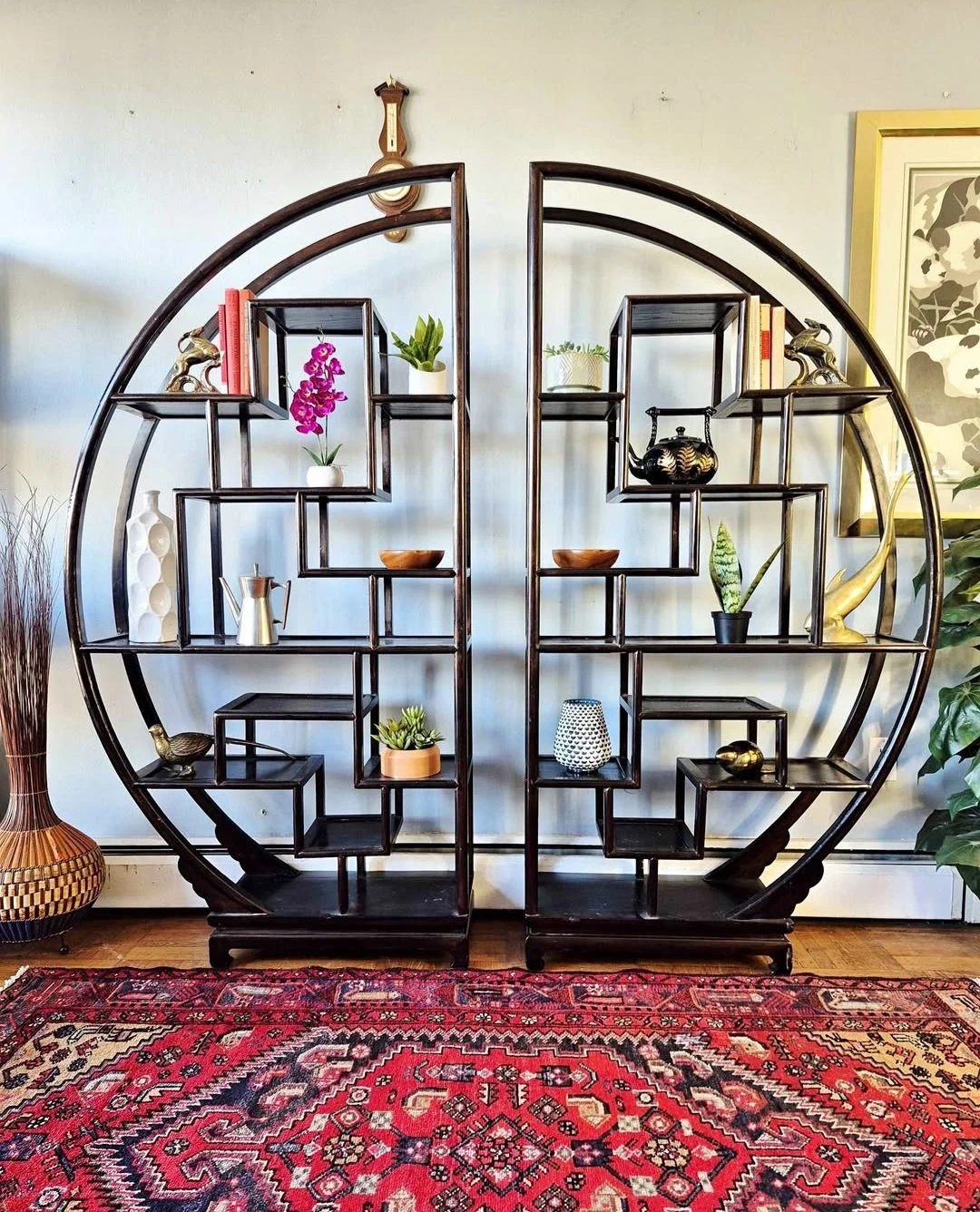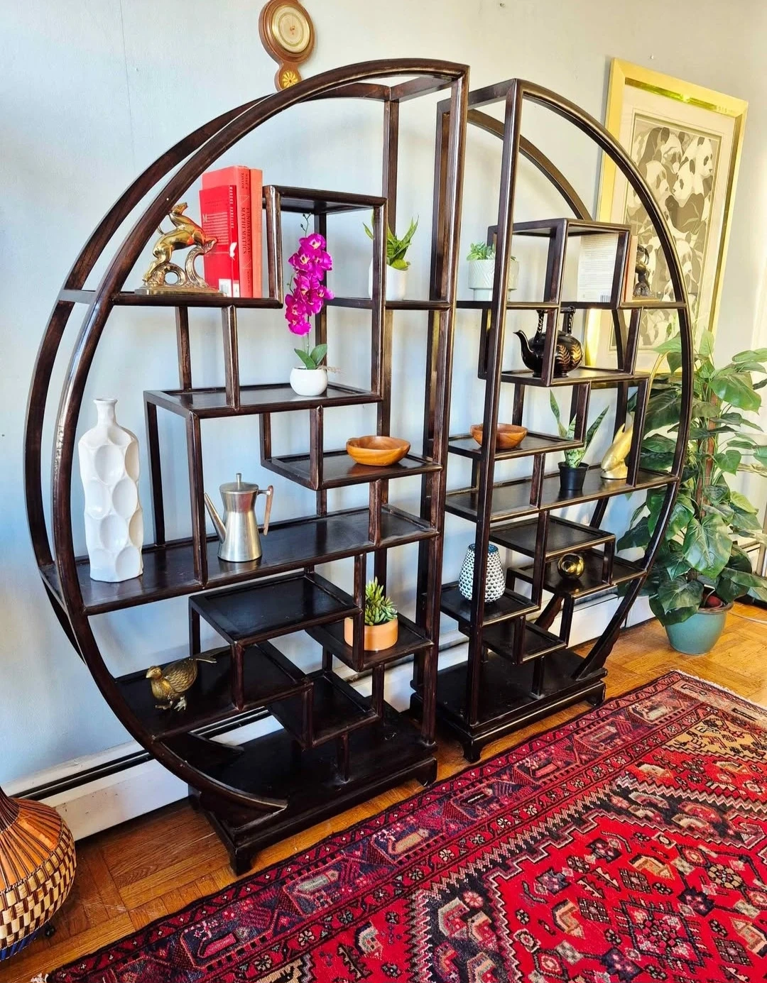 Tags: retro vintage shelf shelves shelving unit wall unit bookcase etagere living room dining room media stand console entertainment unit bookshelf rosewood mahogany walnut solid wood round partition room divider Asian Chinese Japanese plant stand