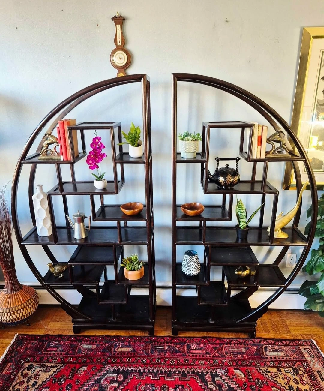 Beautiful two piece solid mahogany yin yang display shelves/room dividers.