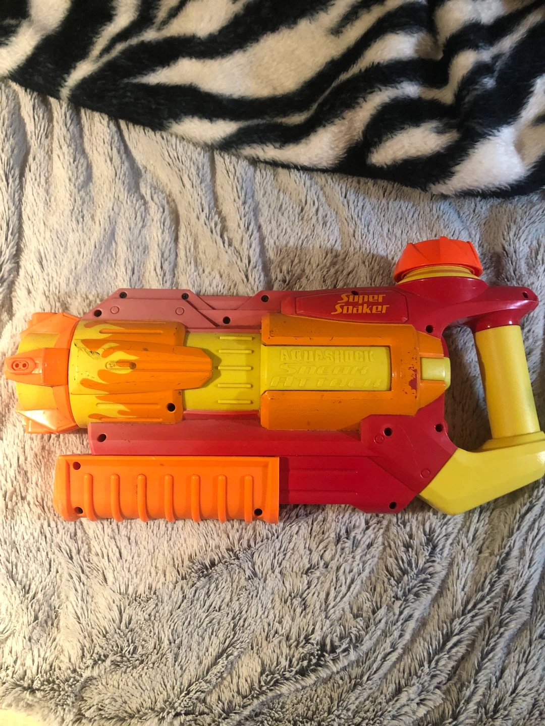 This is a Nerf Super Soaker Aquashock Sneak Attack water blaster. It's red, yellow, and orange with a detachable pump grip. This blaster is great for backyard fun on a warm day!
