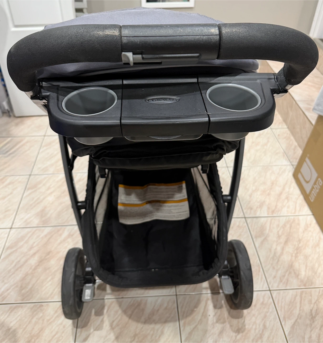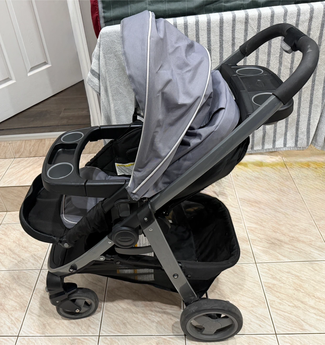 This is a Graco stroller in black and grey. It features multiple cup holders and a large storage basket. It's suitable for babies and toddlers. 3 in 1 Graco Modes click connect stroller