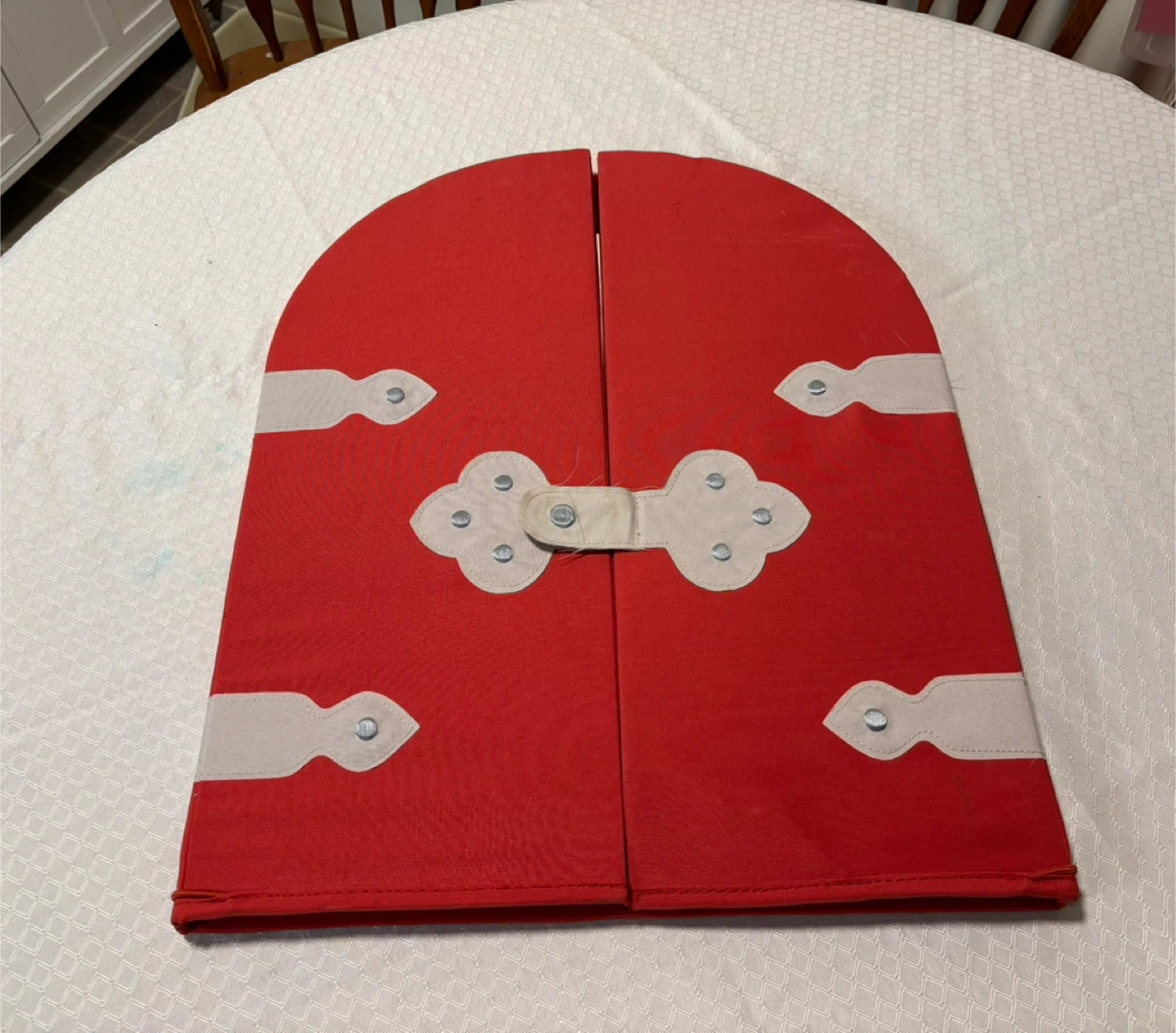 This fun vintage red plastic play mirror has two fold-out side panels with mesh pockets. It's perfect for toddlers to explore their reflection and store small toys. The mirror is enclosed in a soft, durable fabric.