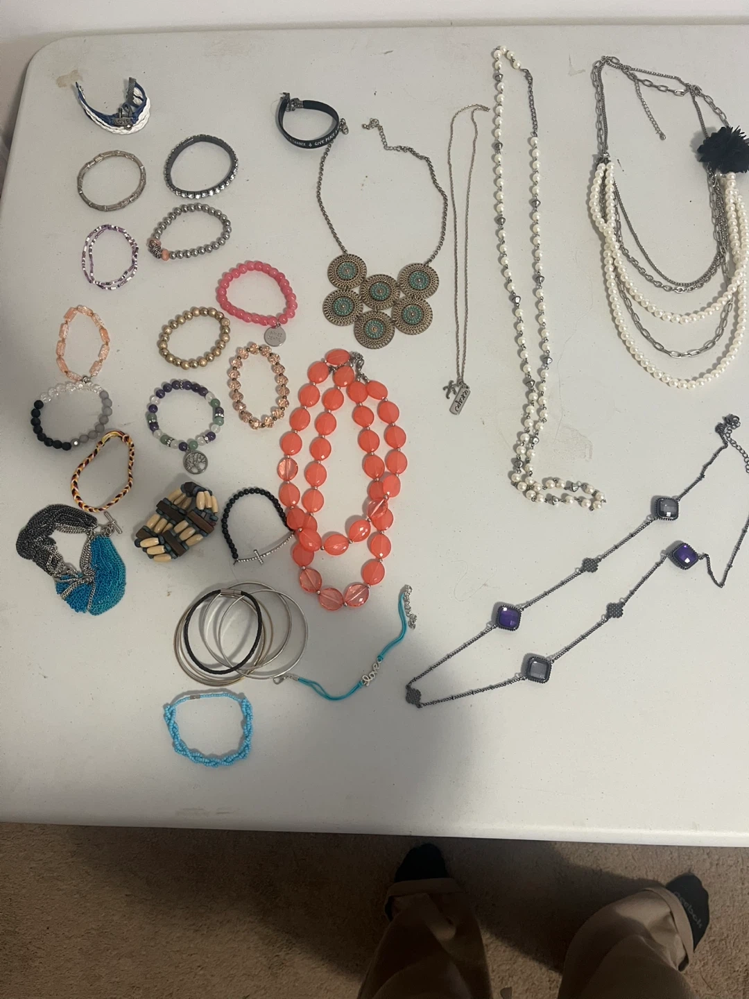 This is a collection of bracelets and necklaces. It includes beaded bracelets, a blue woven bracelet, and a variety of necklaces with different pendants and chain styles. A few items have a floral or geometric design.