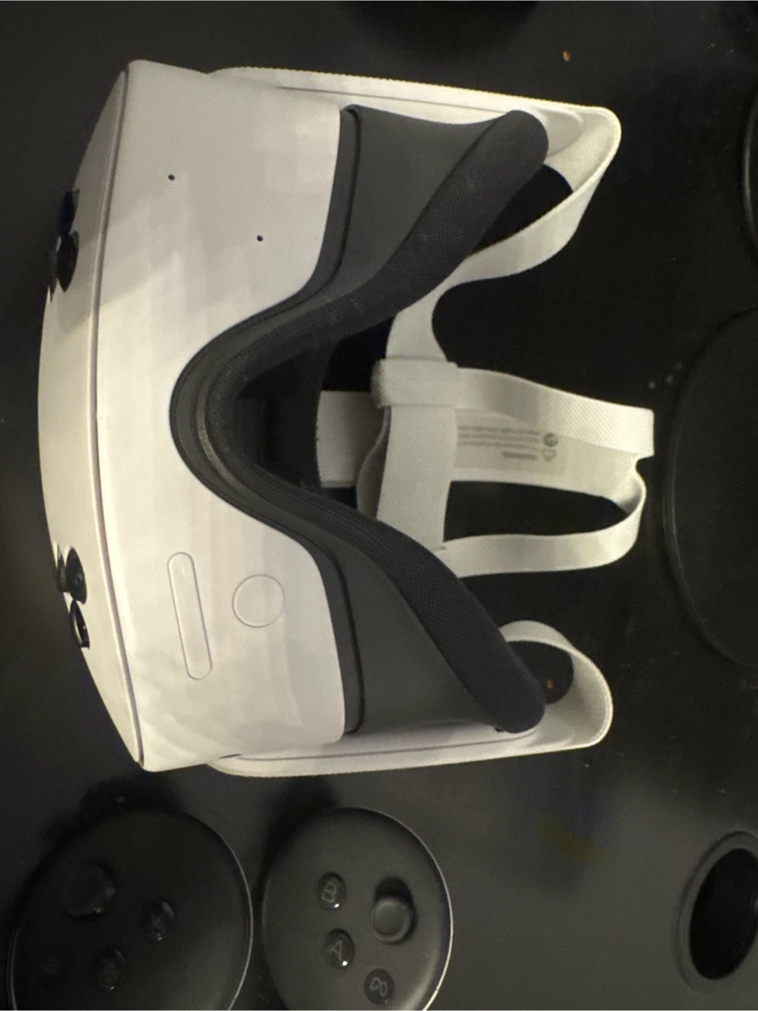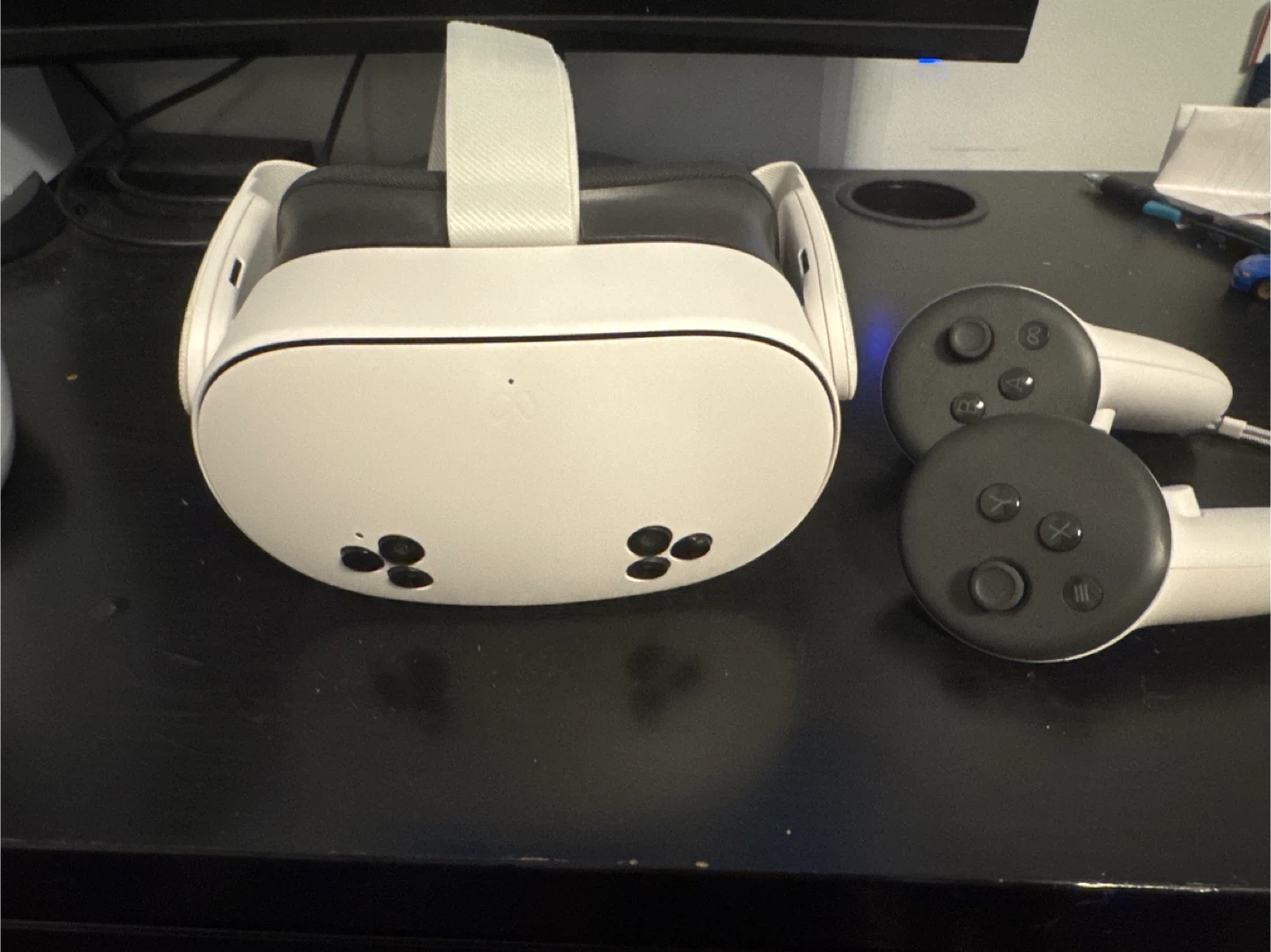 White Meta Quest 3s 256gb VR headset with two controllers. It's a virtual reality system for immersive experiences. Comes with straps and adjustable fit. Also have box and receipt of purchase, if you are not too far I can also drop off