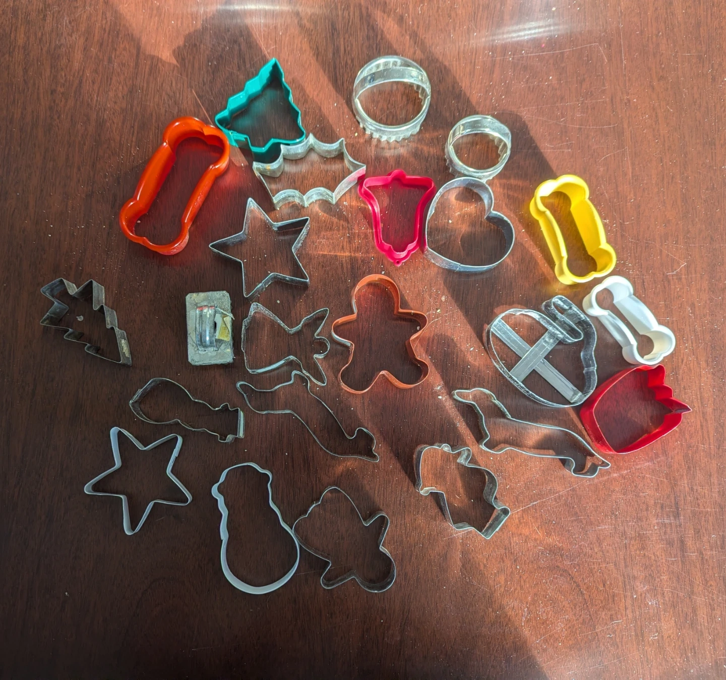 This is a collection of various cookie cutters. Shapes include a gingerbread man, dog, star, snowman, heart, and Christmas tree. There are also bone shapes and circles. Some are metal, and some are plastic. They're great for baking fun shapes!