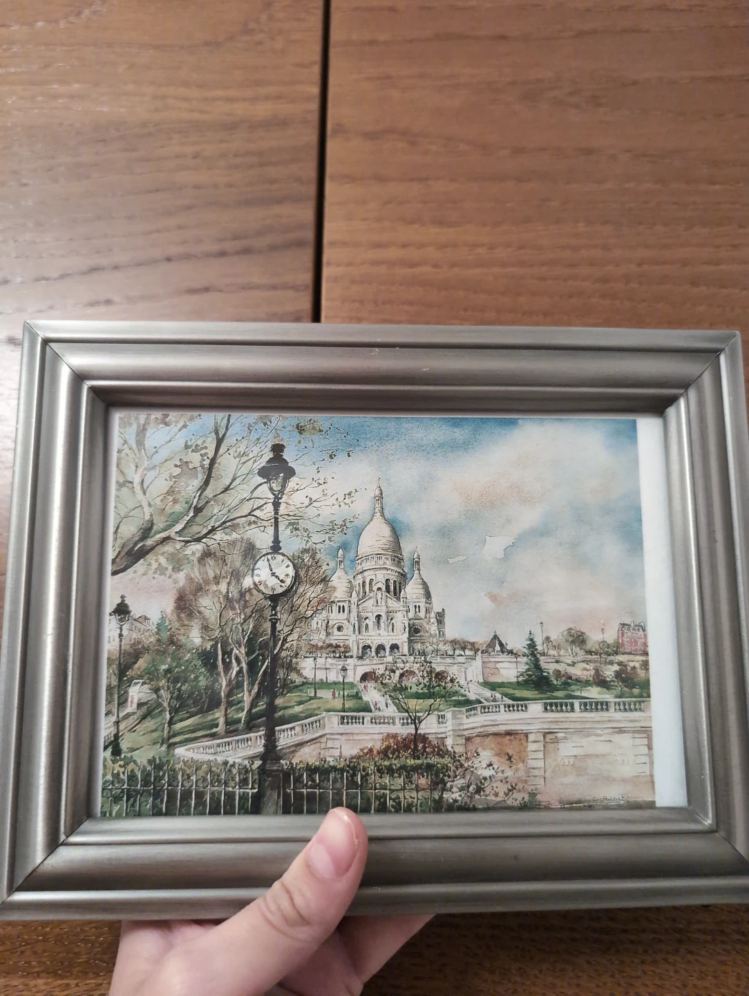 This is a framed watercolour print featuring the iconic Sacré-Cœur Basilica in Paris, complete with a classic lamppost and clock. The artwork is housed in a brushed silver-tone frame. It's a lovely piece for anyone who enjoys European cityscapes.