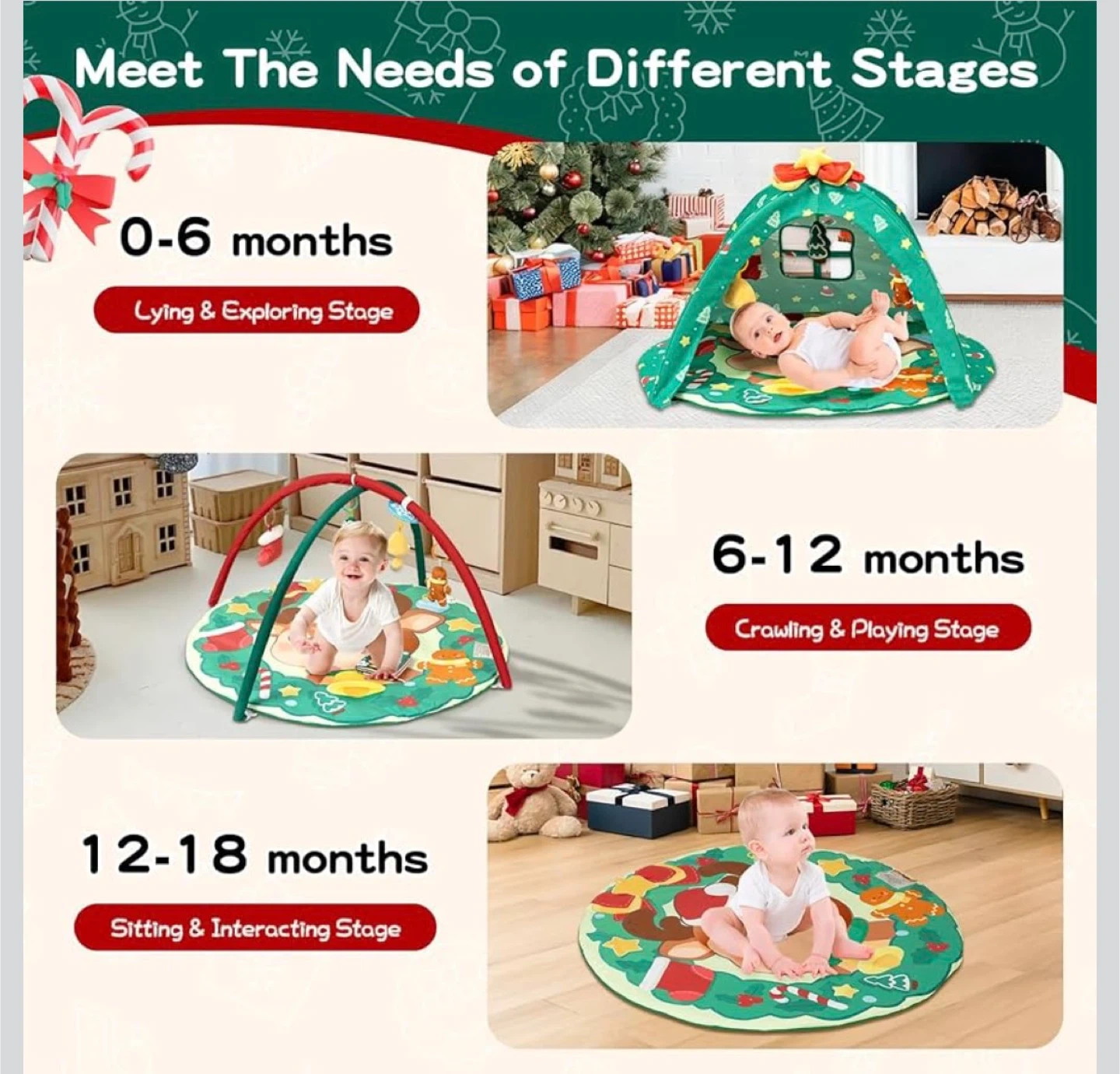 This activity gym features a cute Christmas-themed design with a reindeer, festive elements, and multiple hanging toys. It includes a peek-a-boo window and a thick mat for comfort. OEKO-TEX certified for safety.