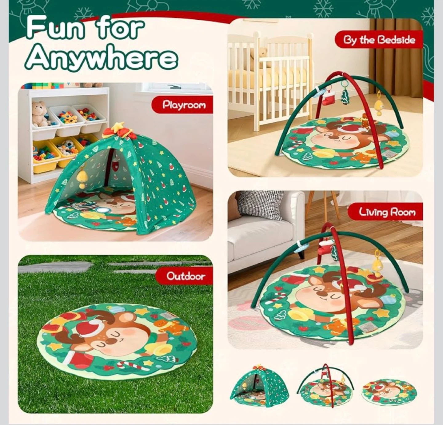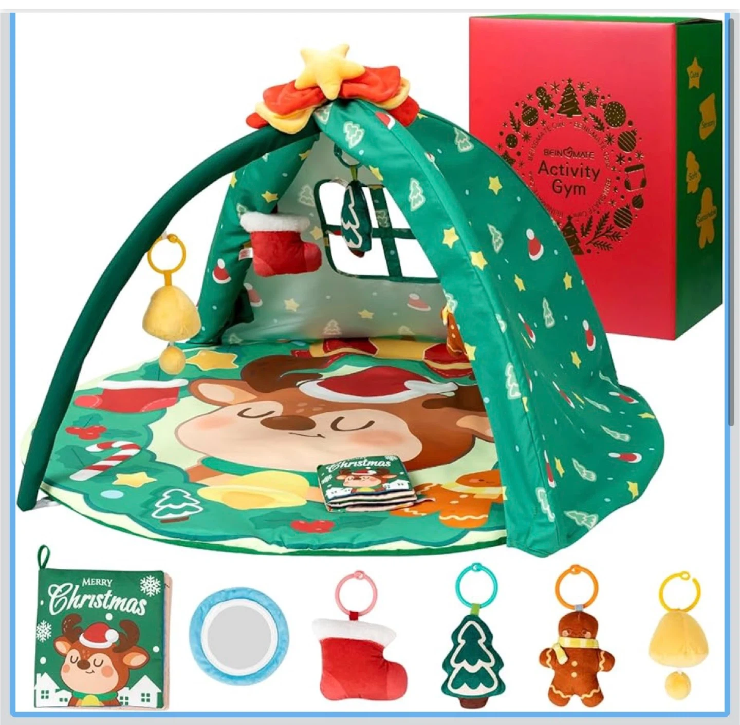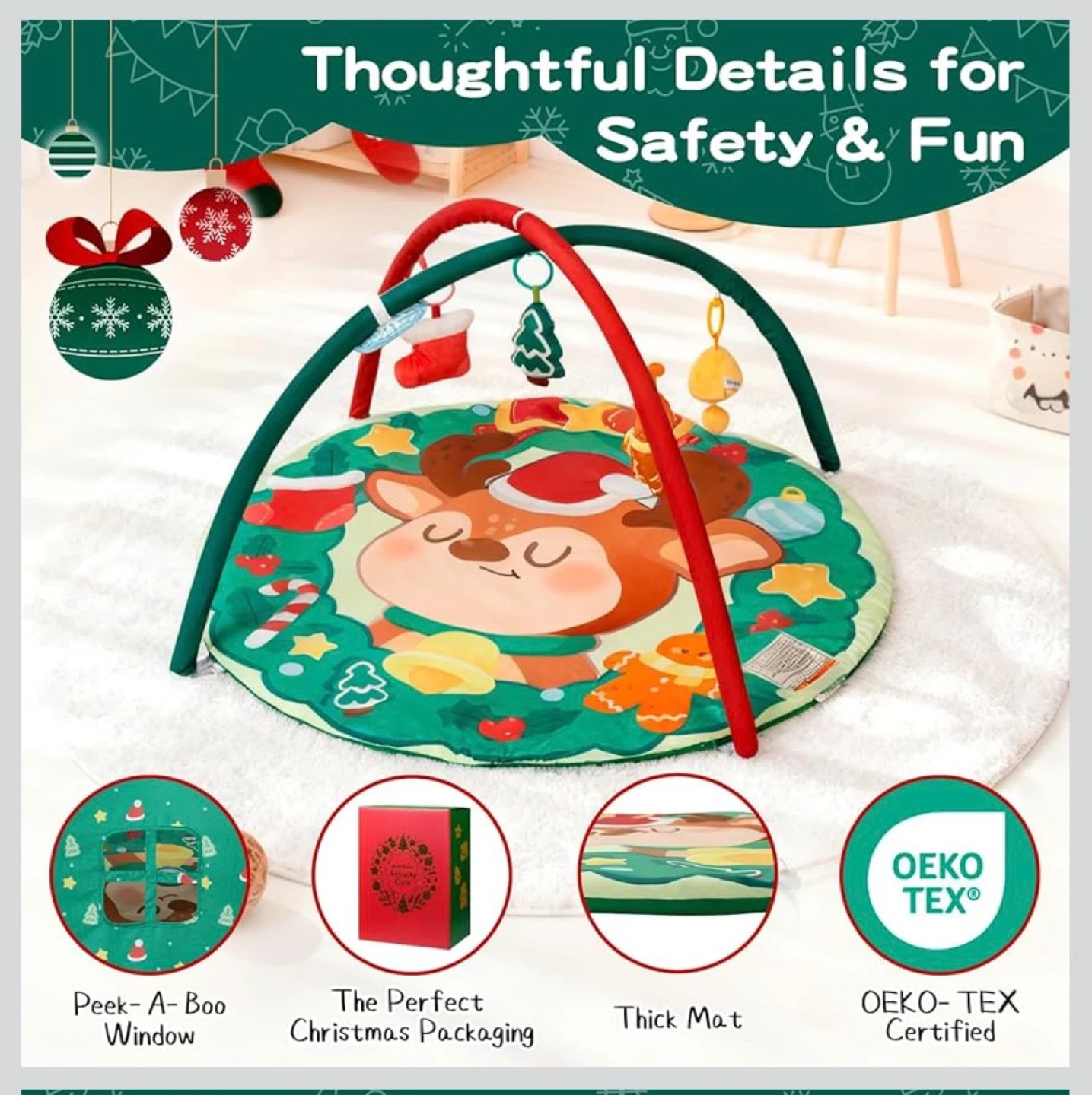 This activity gym features a cute Christmas-themed design with a reindeer, festive elements, and multiple hanging toys. It includes a peek-a-boo window and a thick mat for comfort. OEKO-TEX certified for safety.