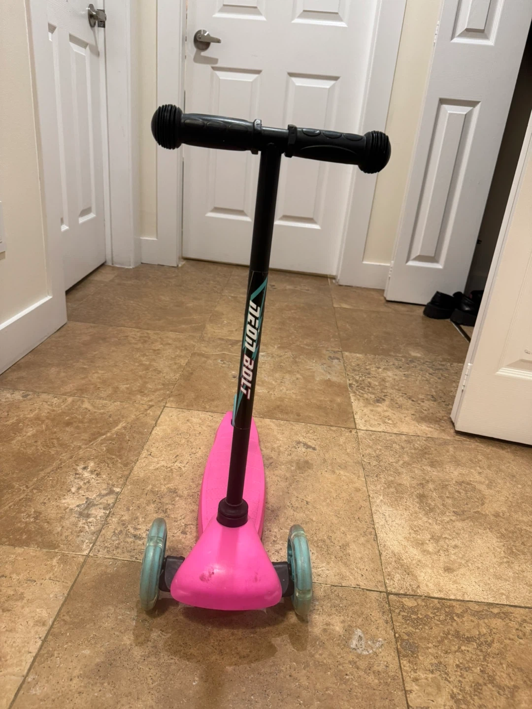 Bright pink 3-wheel scooter for kids. Features a Neon Bolt design on the handlebar. It's built for stability and fun outdoor play.
