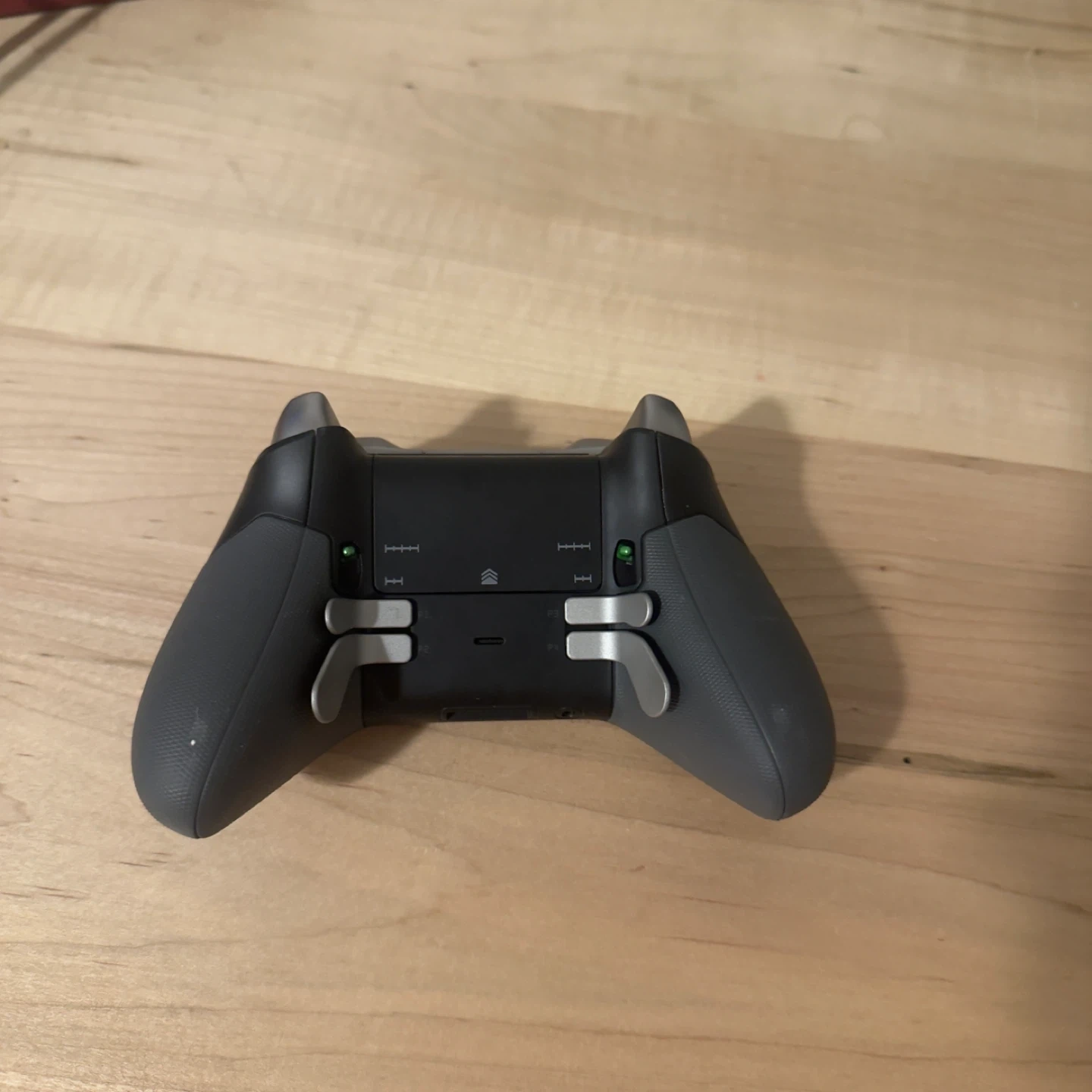 This is an Xbox Elite Series 2 controller. It's black with silver and grey accents. Features a textured grip and paddle attachments on the back.