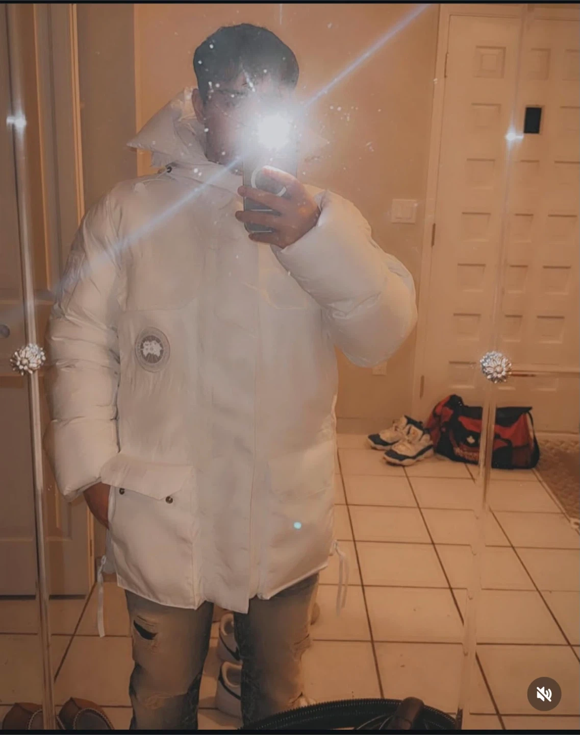 This is a white Canada Goose paradigm puffer parka. It features a hood and multiple front pockets. This coat is excellent for cold weather conditions.
