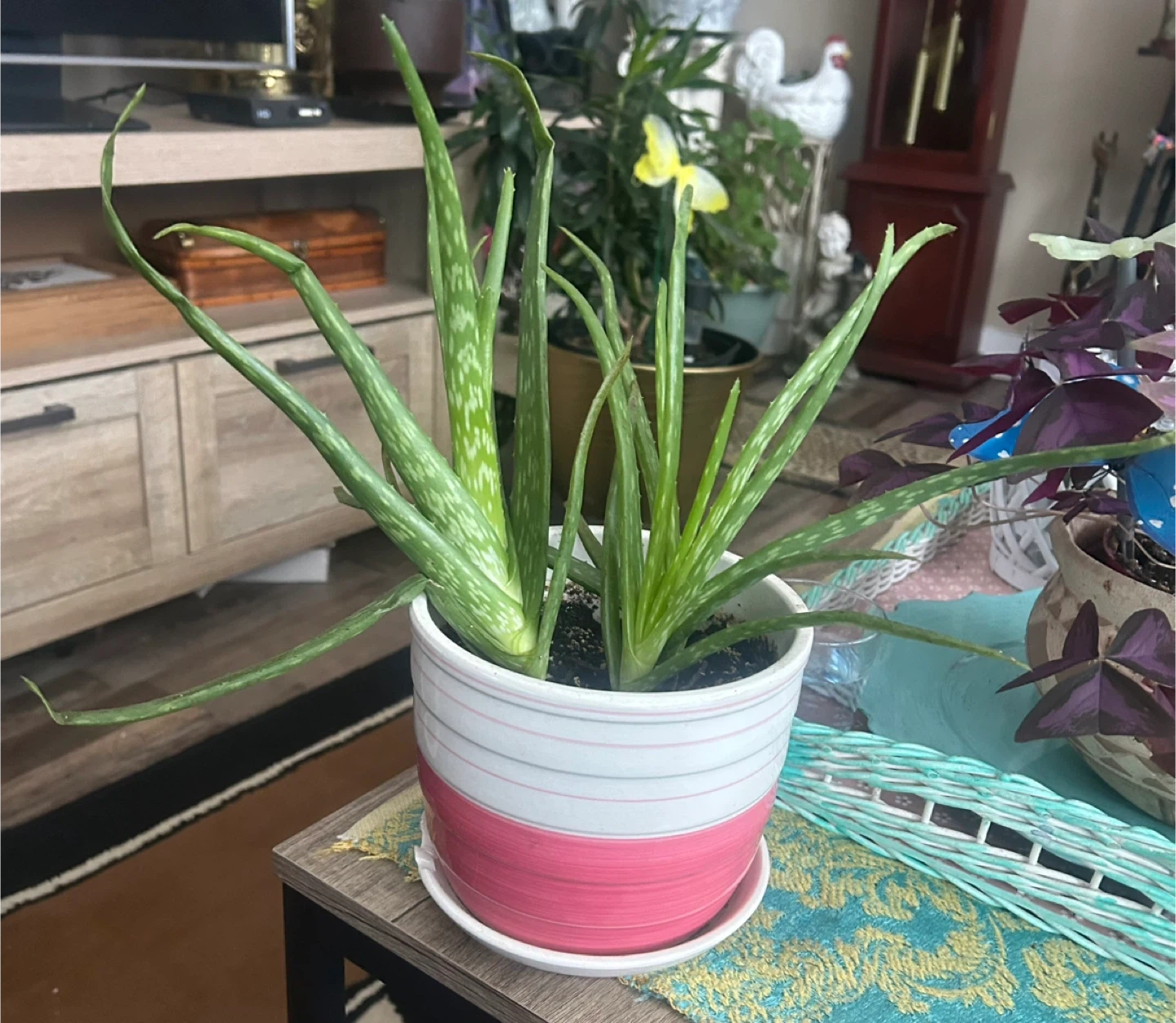 Healthy Aloe Vera plant potted in a ceramic planter. It's a beautiful addition to any home or office space. The plant is easy to care for. This aloe vera plant is ready for its new home!
