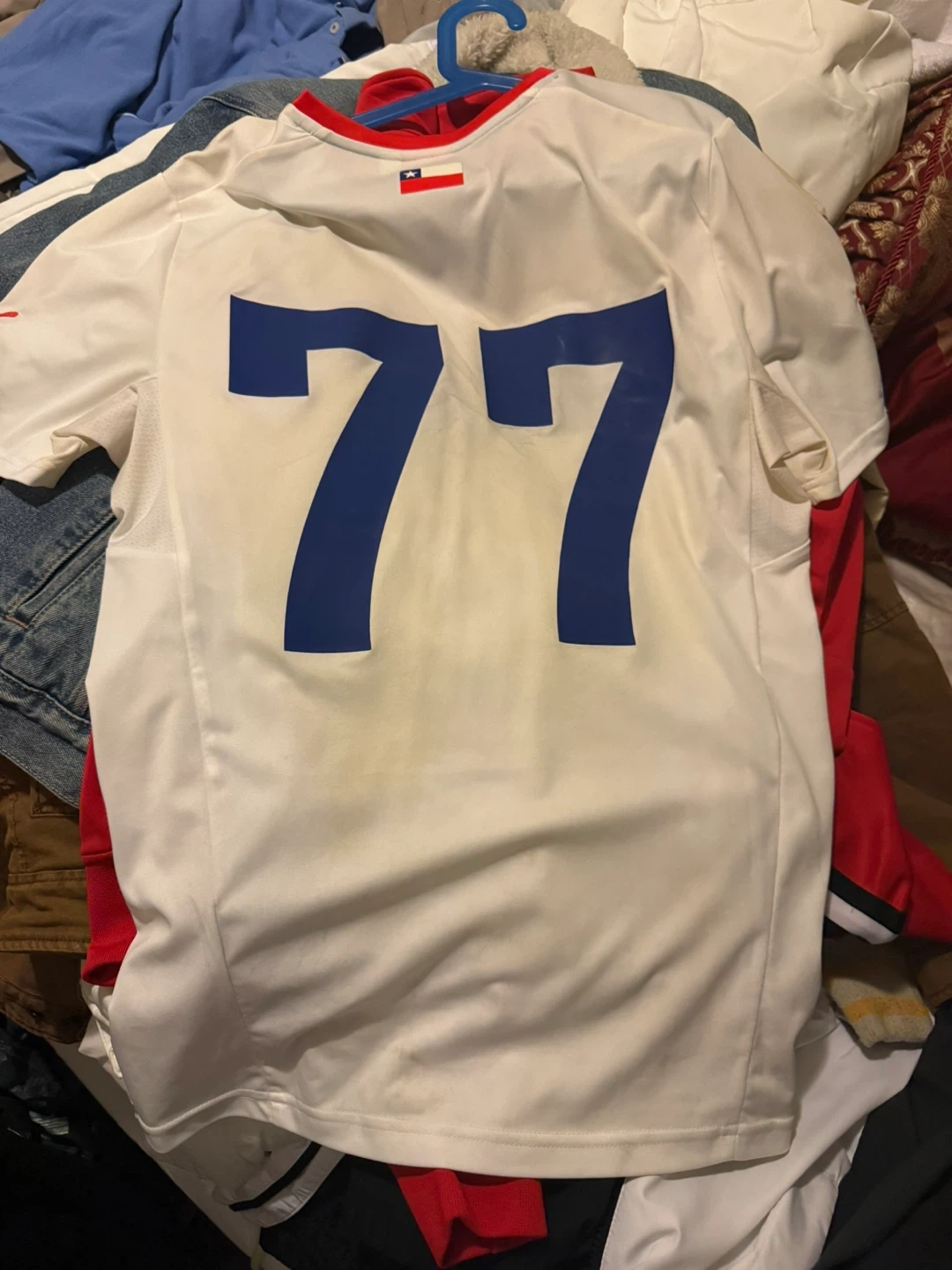 White Puma soccer jersey for the Chile National Team. Features the number 77 on the front and back. Made with breathable, moisture-wicking fabric. Great for cheering on La Roja!