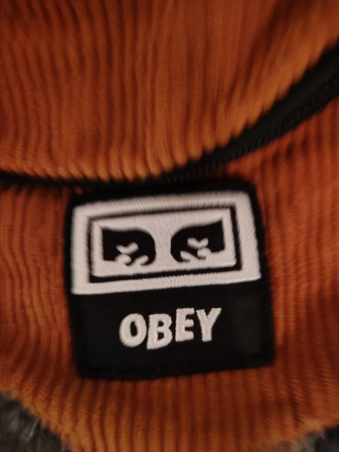This is an orange corduroy fanny pack from OBEY. It has a zippered main compartment and an adjustable strap with a buckle. Corduroy material.