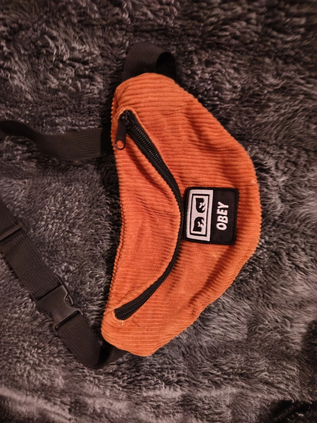 This is an orange corduroy fanny pack from OBEY. It has a zippered main compartment and an adjustable strap with a buckle. Corduroy material.