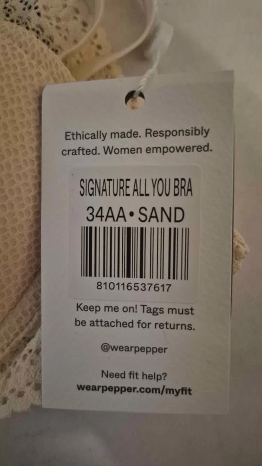 New Pepper Signature All You Bra. Size 34AA. Super comfy and supportive, great for smaller busts. Has original tags still on. Color is sand, a nice neutral shade.