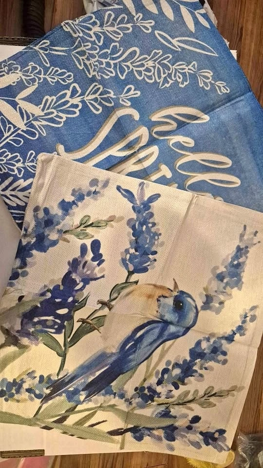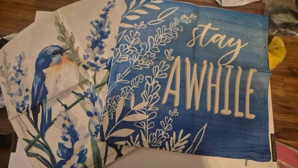 Beautiful set of 4 Fahrendom throw pillow covers with bluebird and lavender flower designs. Two covers have the text 'Stay Awhile' and 'Choose Happy'. Great for spring decor, porch, patio, or sofa. Each cover is 18x18 inches.