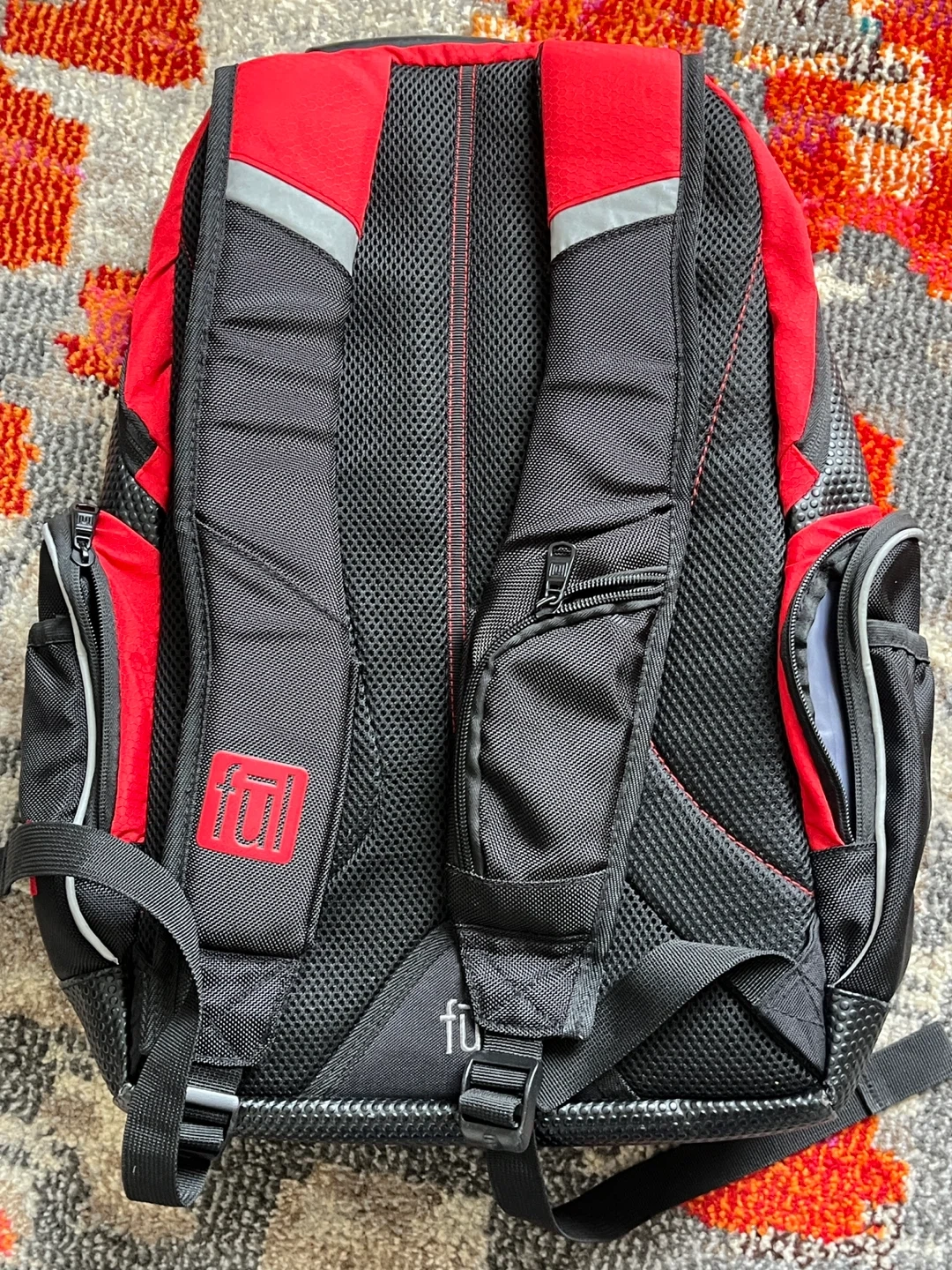 This is a Ful brand backpack with a red and black colour scheme. It features padded shoulder straps and multiple zippered pockets. It's a durable backpack ready for school or travel!