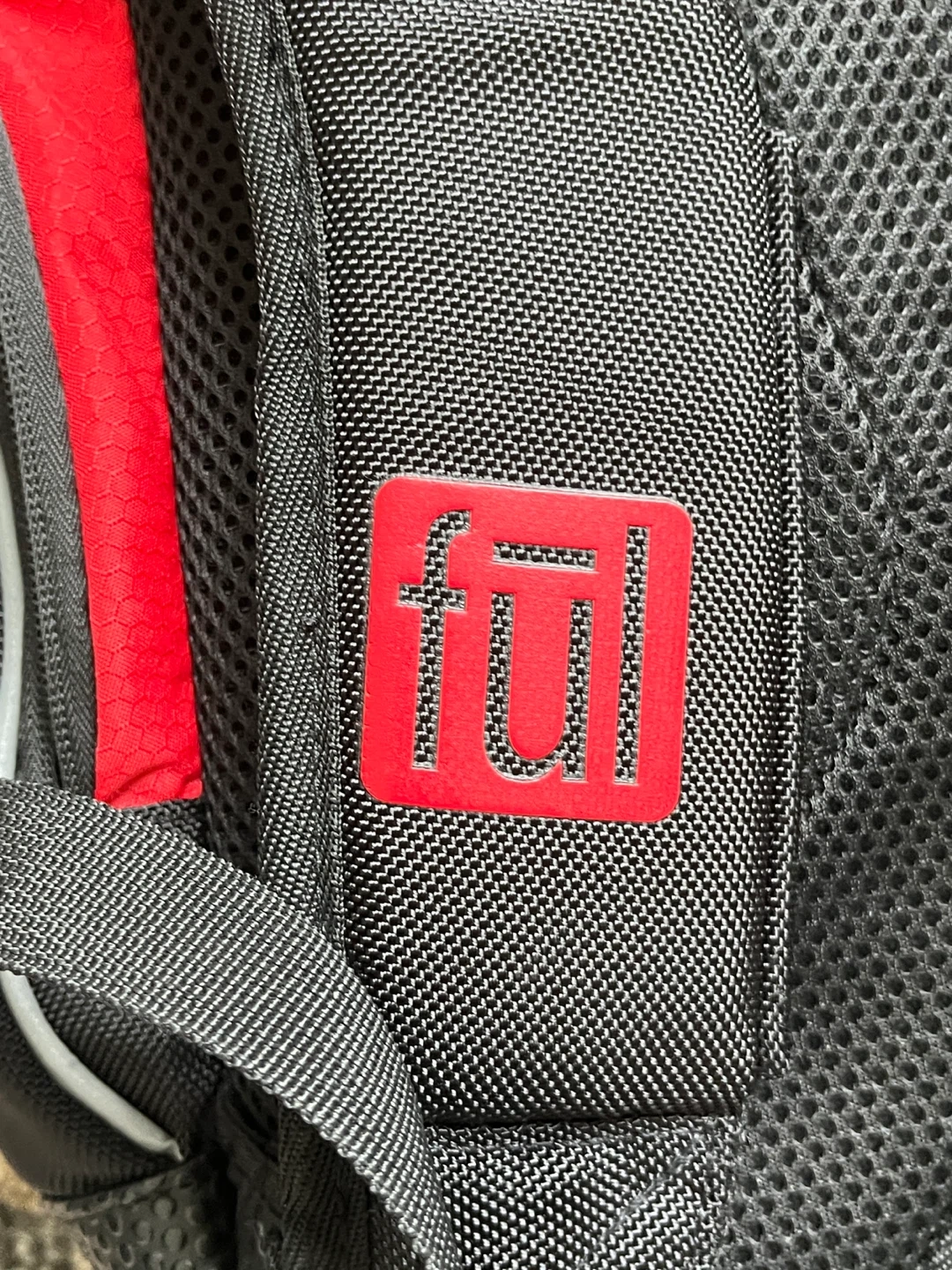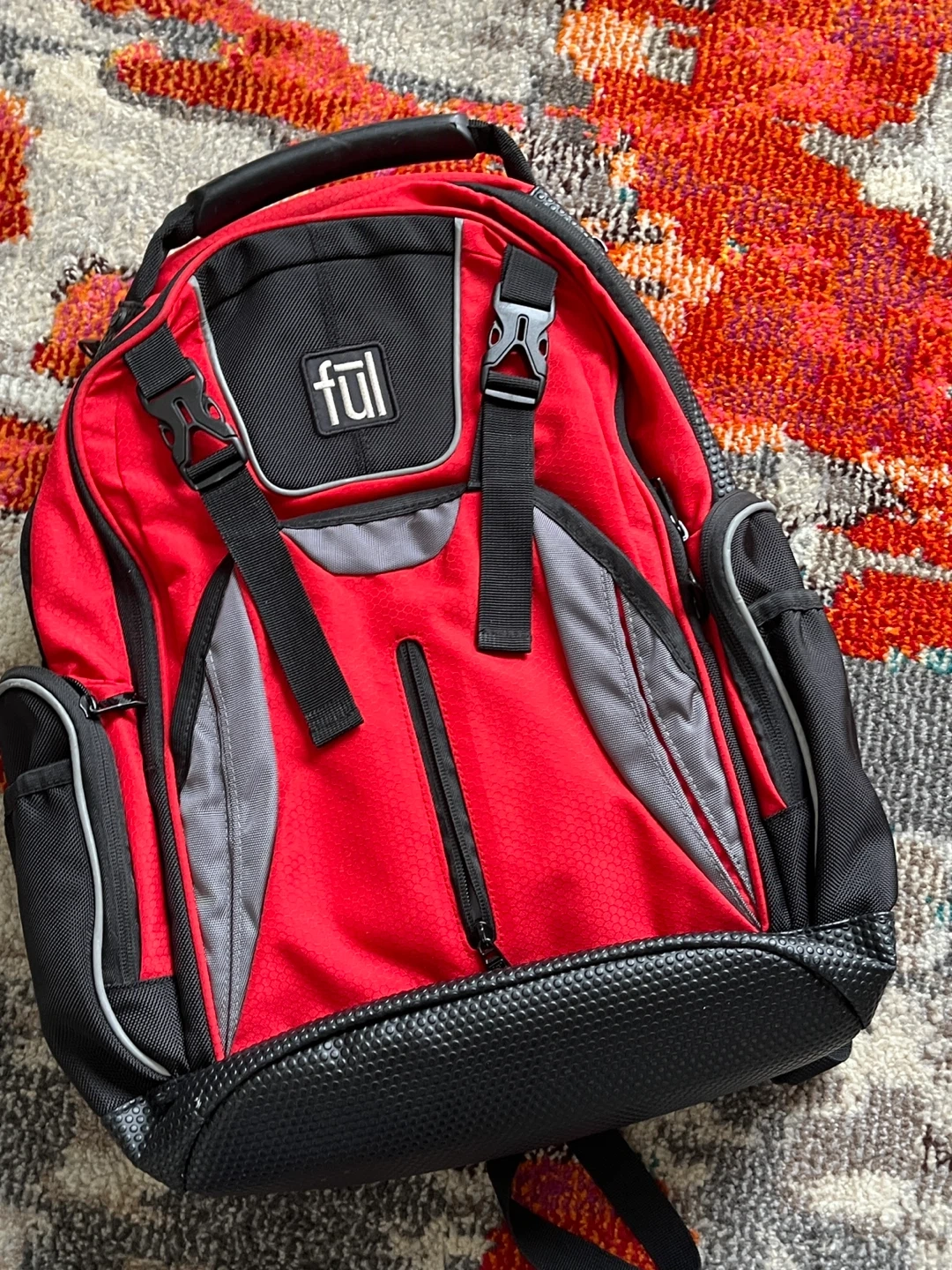 This is a Ful brand backpack with a red and black colour scheme. It features padded shoulder straps and multiple zippered pockets. It's a durable backpack ready for school or travel!