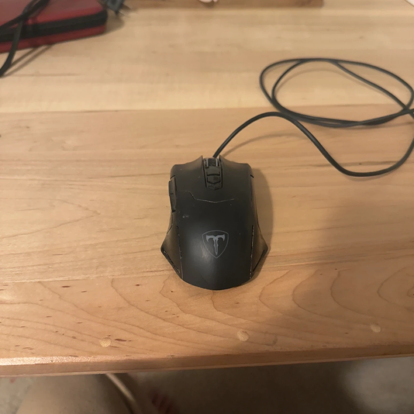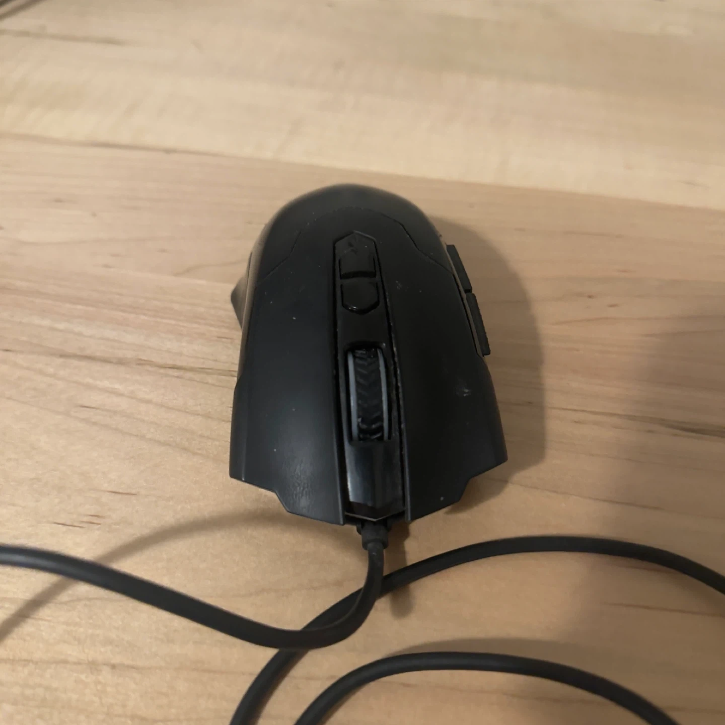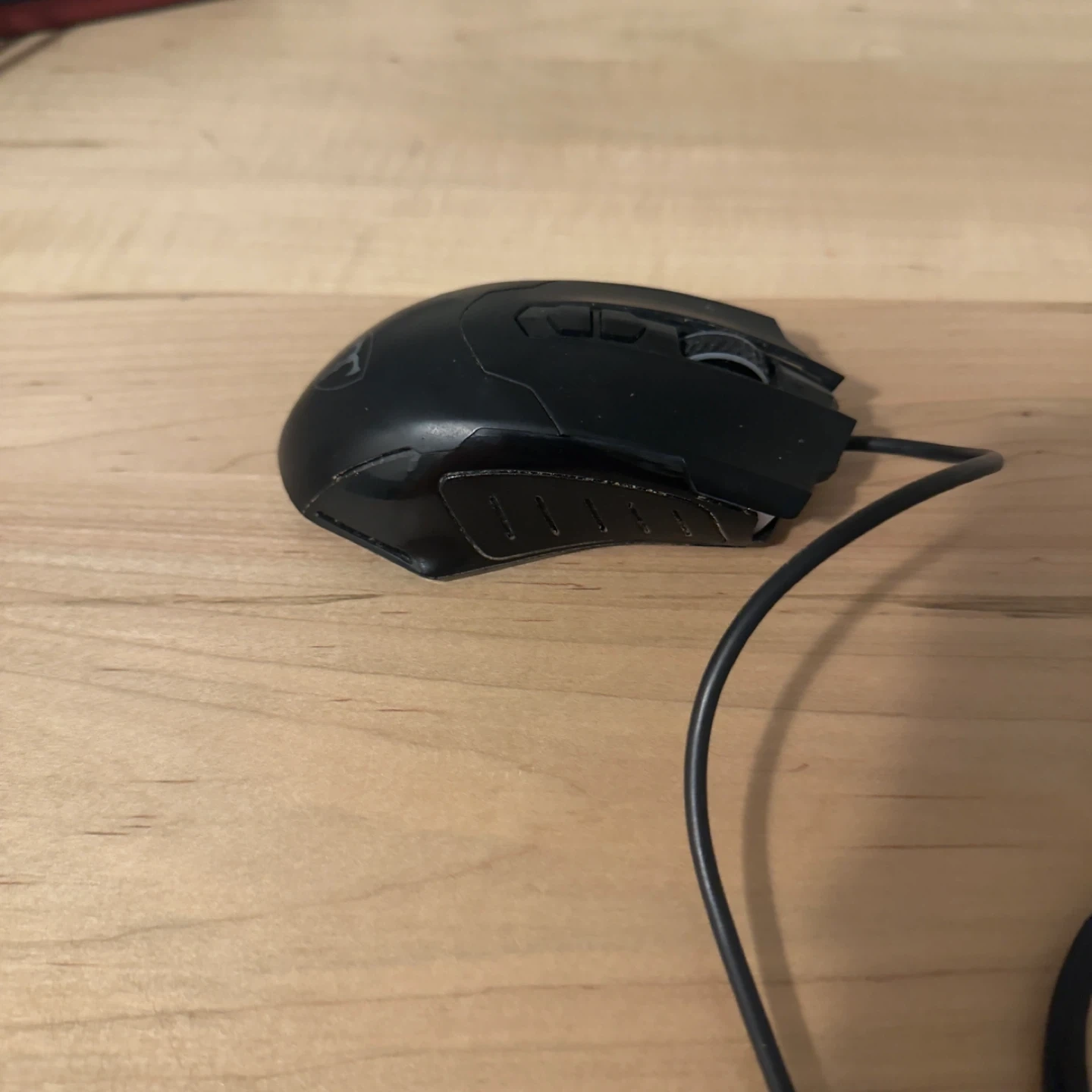 This is a black wired gaming mouse. It features additional buttons on the side for custom commands. Its ergonomic design is made for comfort during long gaming sessions.