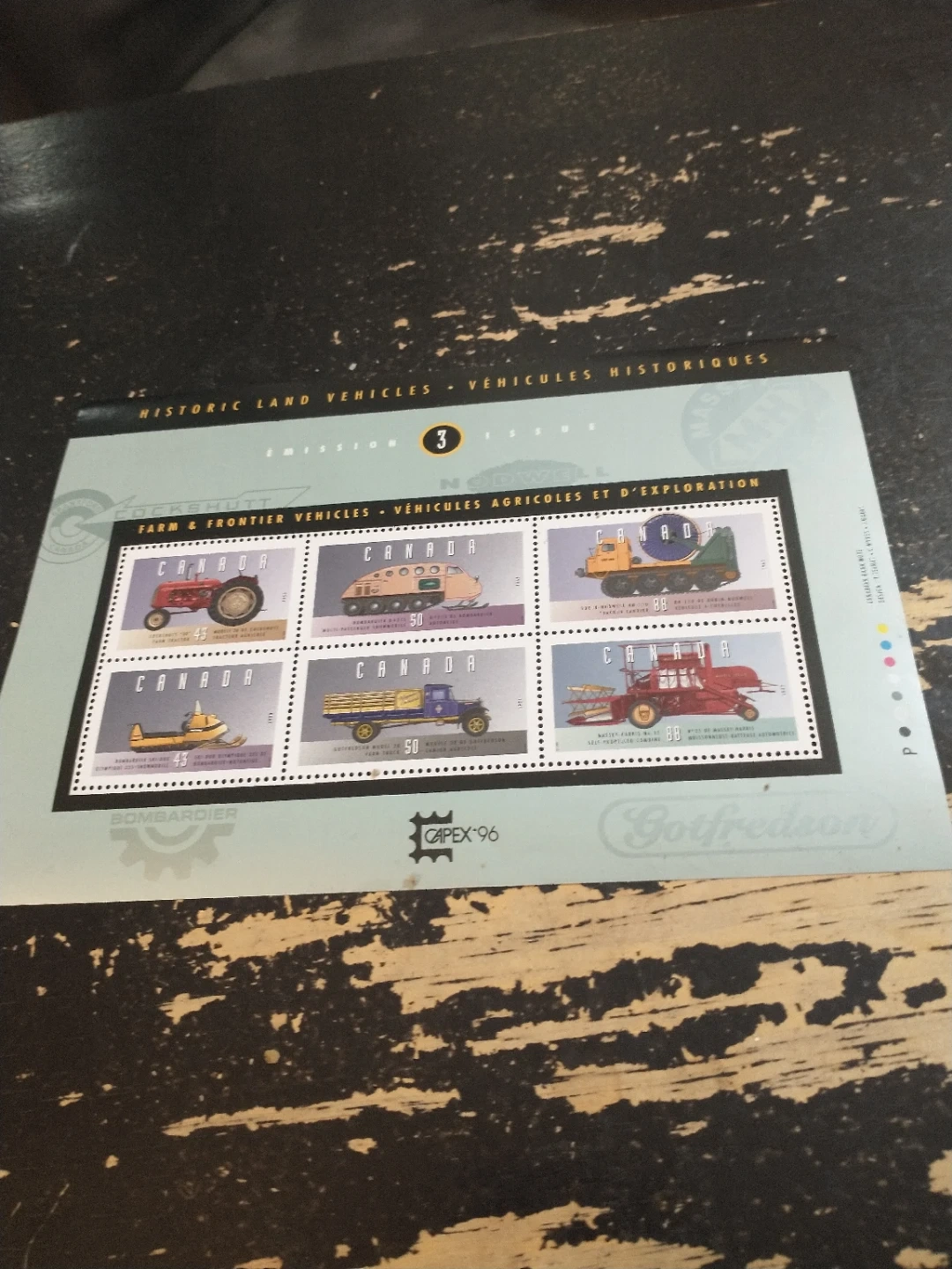 In envelope 11. This is a stamp sheet featuring historic Canadian farm & frontier vehicles. It includes images of a tractor, snow vehicle, and trucks. The sheet is from CAPEX '96. It's a great collectible for history buffs!