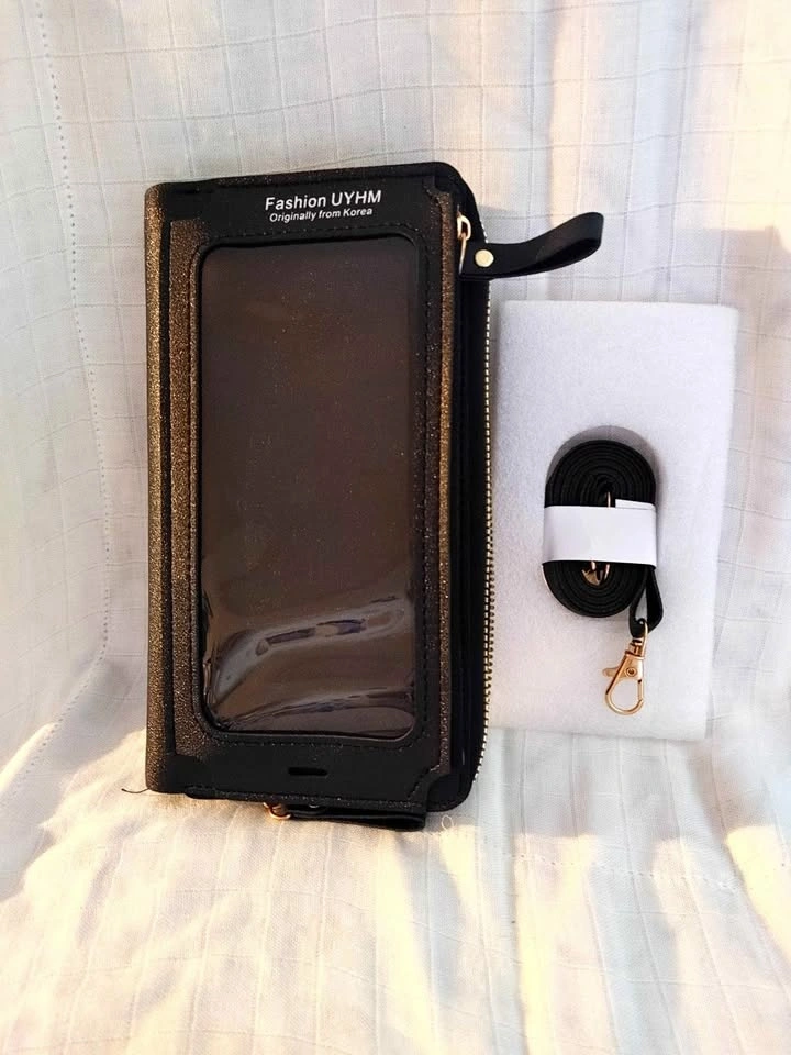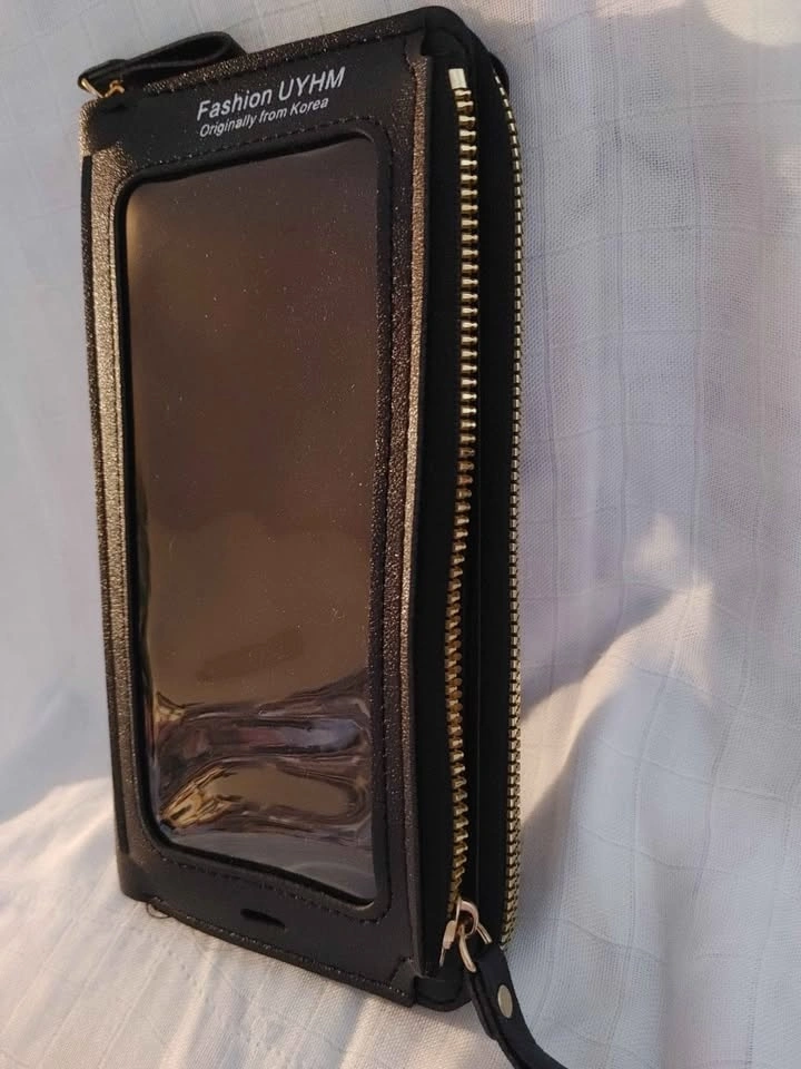 Black wallet with a clear phone pocket and card