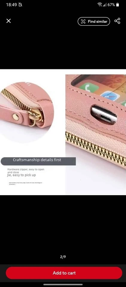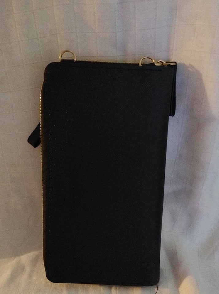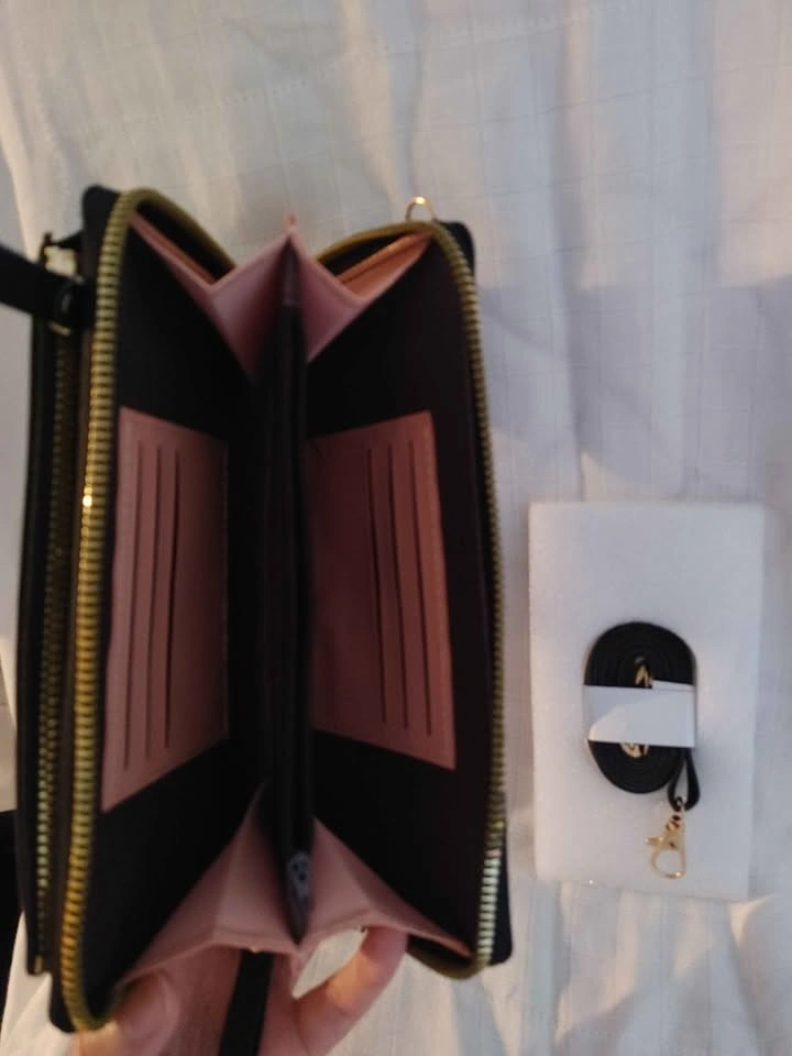 slots. Made of faux leather with a detachable strap. The phone compartment is separate from the wallet.