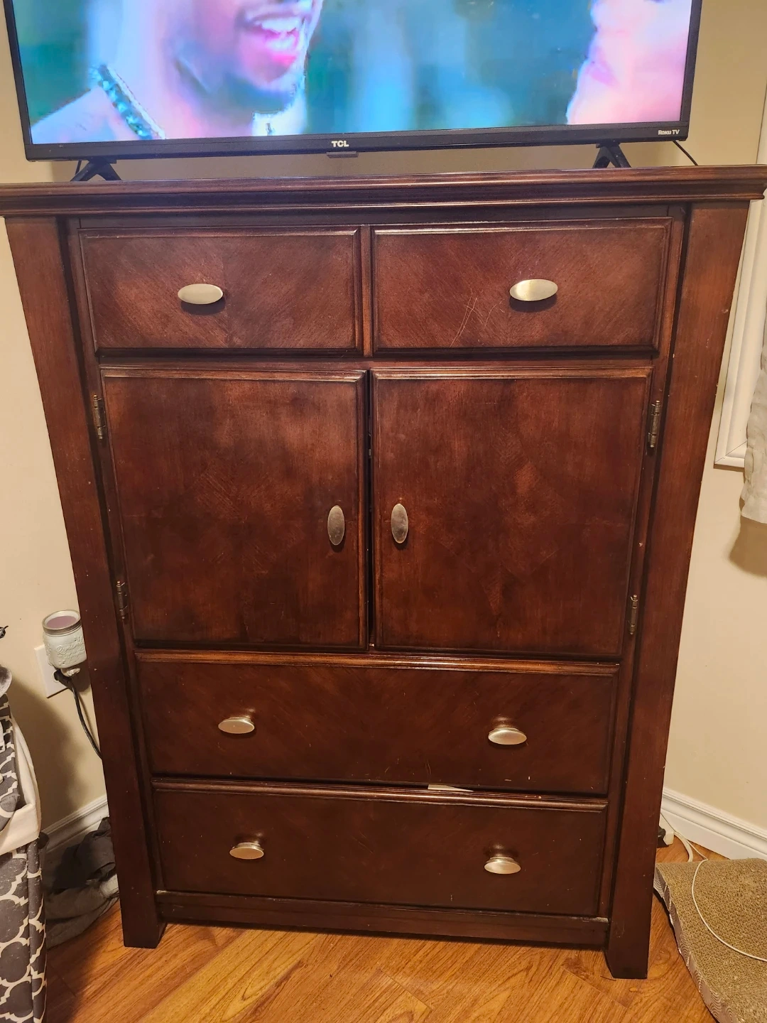 This dark wood dresser features six drawers for ample storage. In decent condition. Have the whole bedroom set if interested.