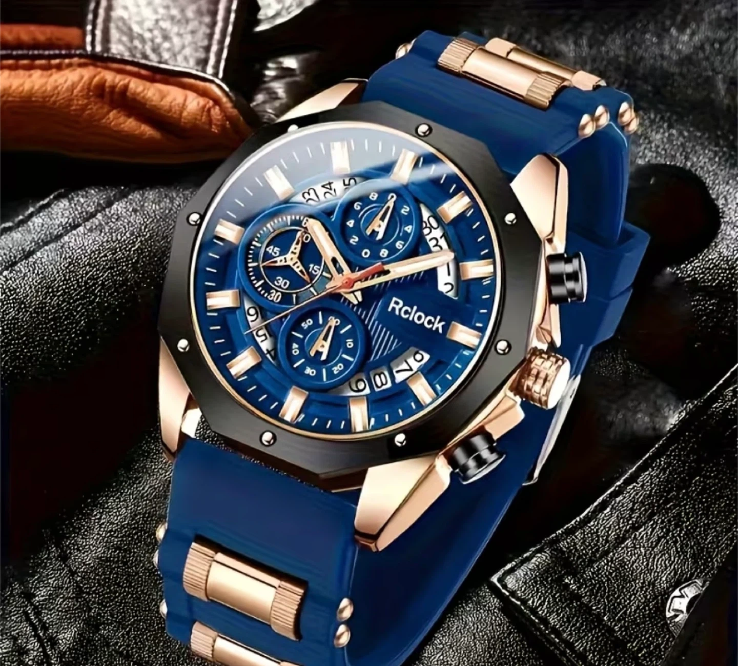 This Rclock chronograph watch features a blue dial with rose gold accents. Dial diameter is 4.5cm, and band width is 2.4cm. Band length is 27cm. The watch weighs 65g. Boxes are not included.