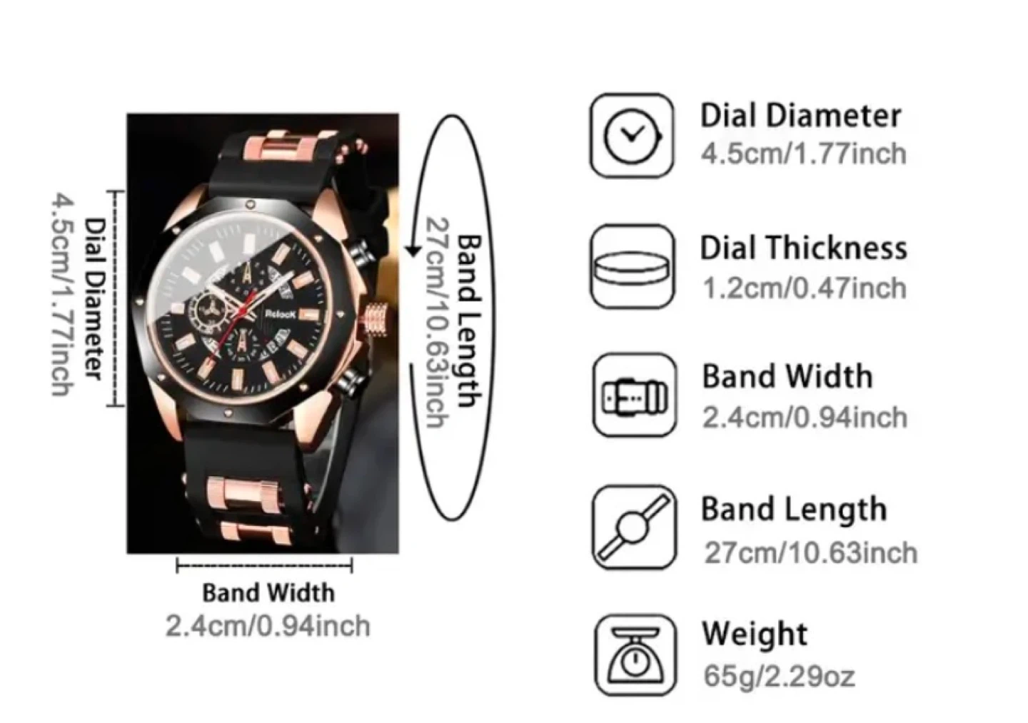 This Rclock chronograph watch features a blue dial with rose gold accents. Dial diameter is 4.5cm, and band width is 2.4cm. Band length is 27cm. The watch weighs 65g. Boxes are not included.