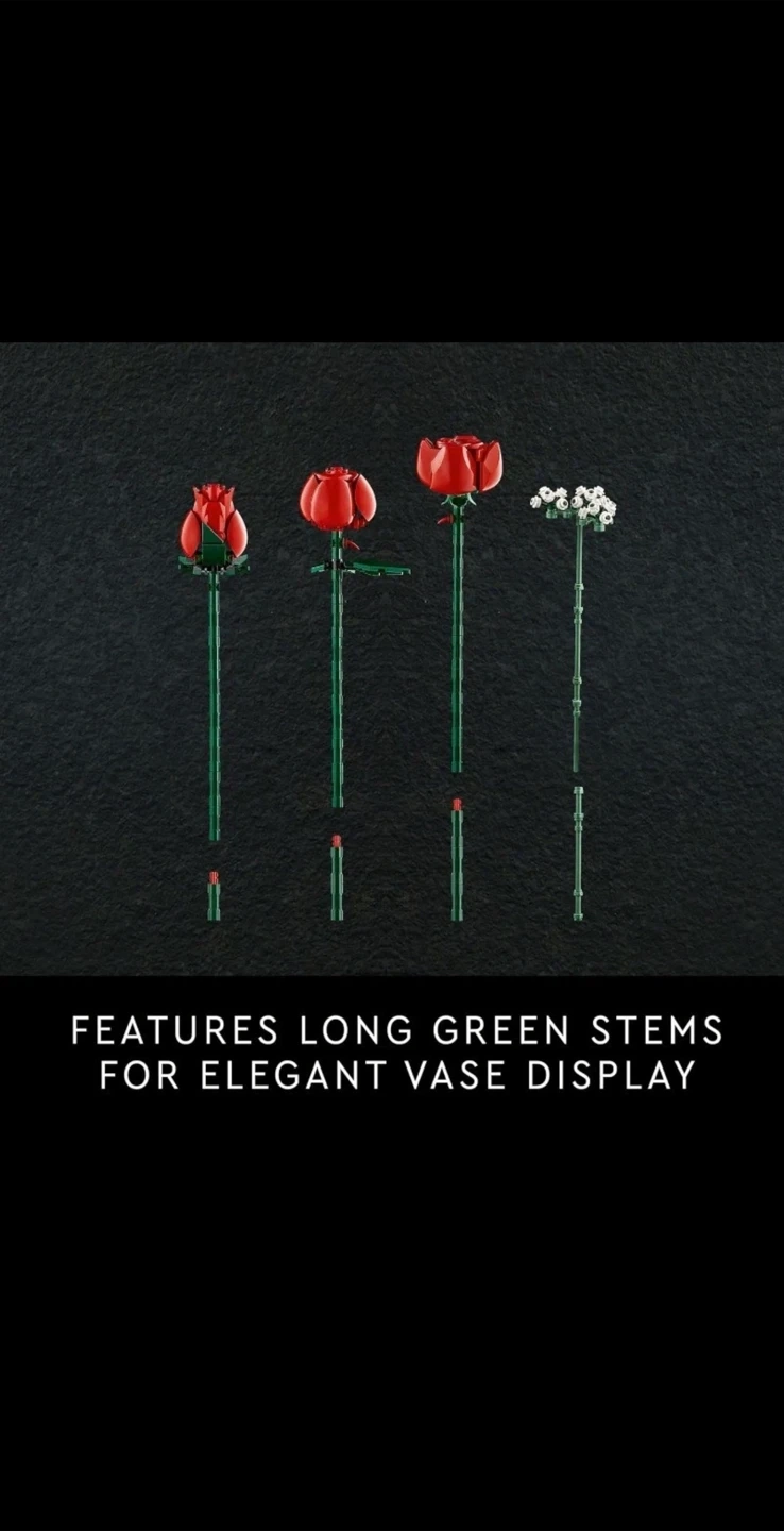 What’s in the box – This creative building set includes everything you need to craft a dozen red roses with long green stems, plus 4 sprigs of baby’s breath with small white flowers