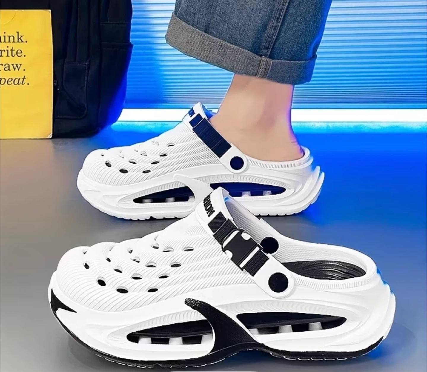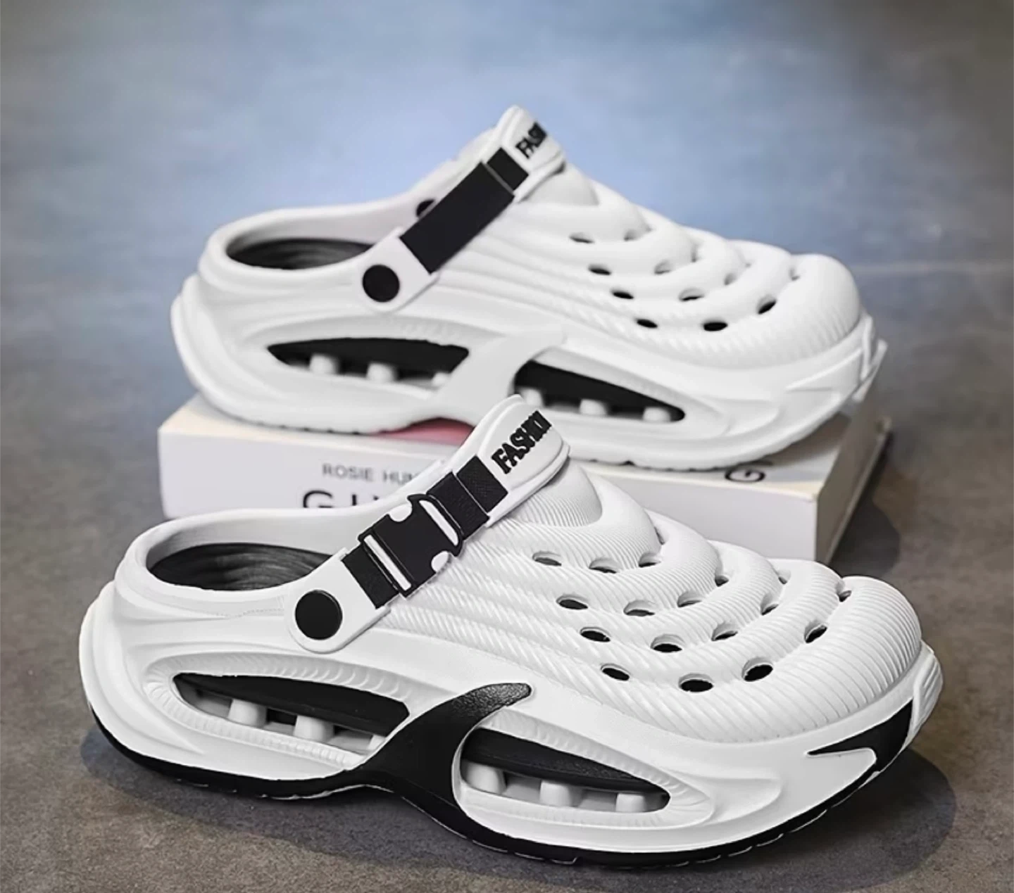 These white clogs feature a breathable design with drainage holes and an adjustable strap for a secure fit. The cushioned sole provides comfort. Perfect for casual wear or water activities!