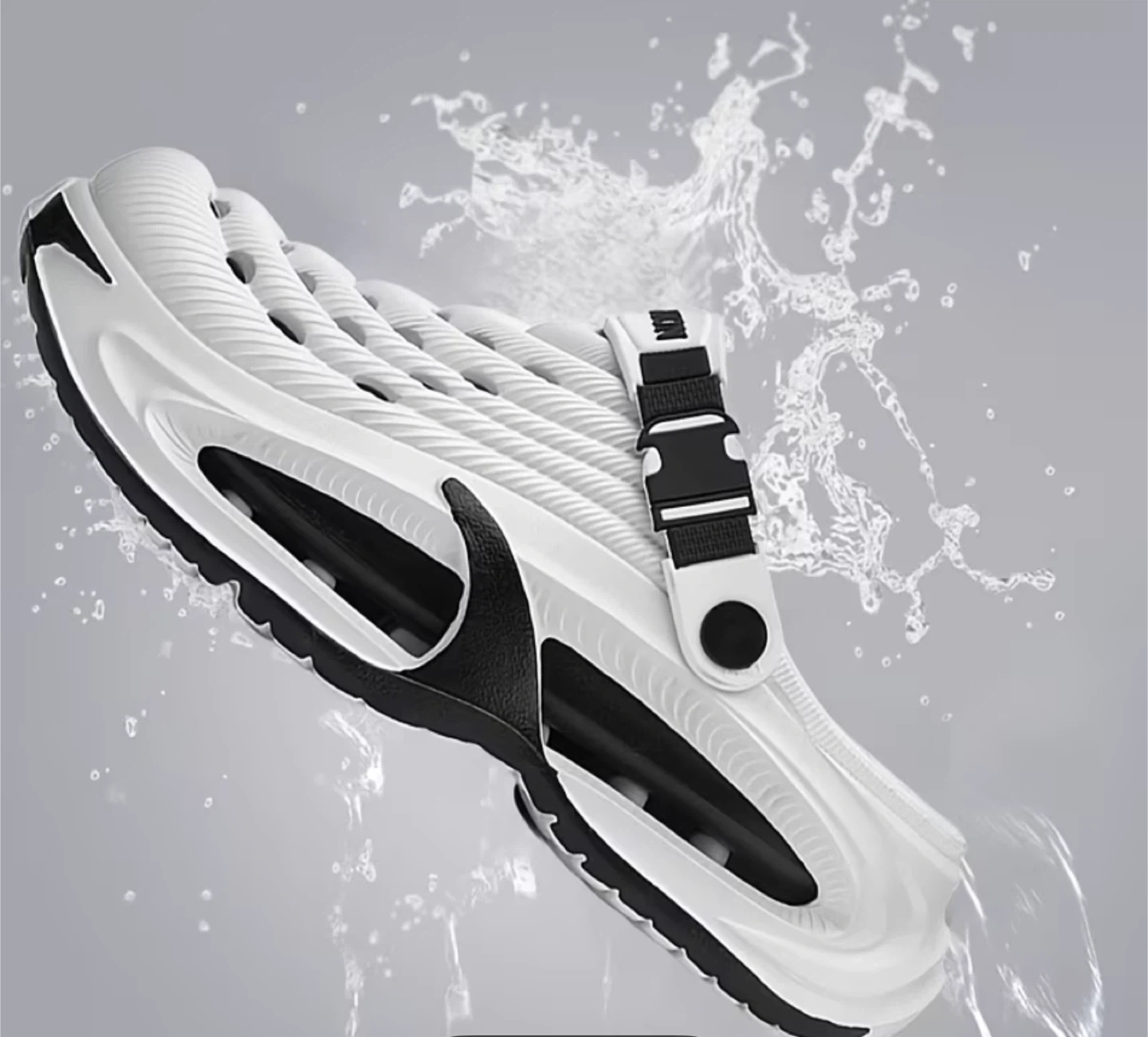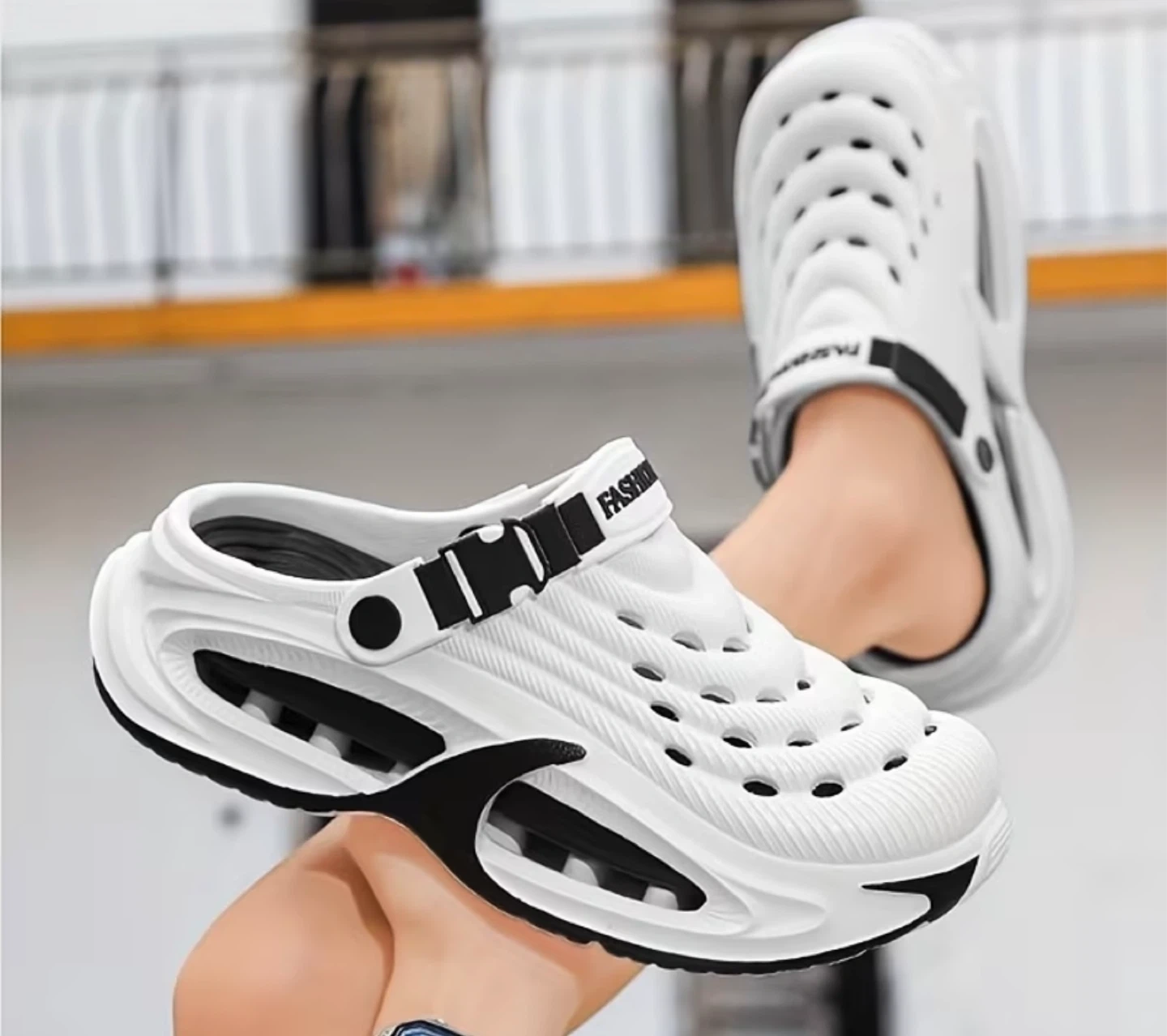 These white clogs feature a breathable design with drainage holes and an adjustable strap for a secure fit. The cushioned sole provides comfort. Perfect for casual wear or water activities!
