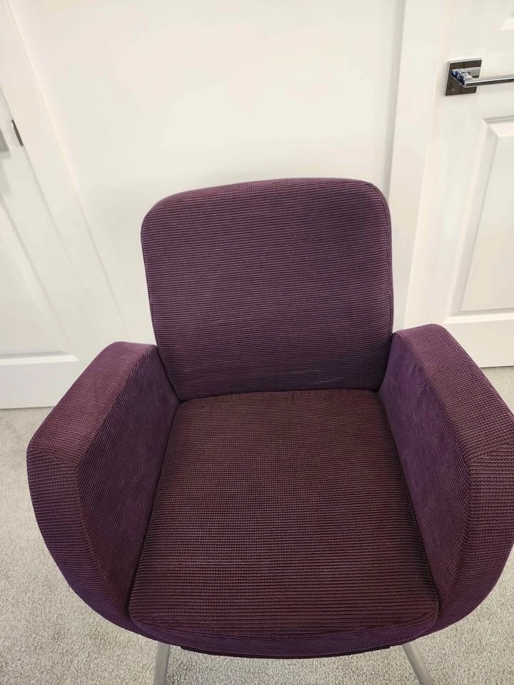 High-quality designer set from Global Furniture Group "Kate". Featuring a stunning plum/aubergine ribbed corduroy fabric and a sleek polished chrome base, this mid-century modern inspired duo is both stylish and built to last. The set is in excellent condition—clean, sturdy, and perfect for a cozy reading nook or a chic office accent. Chair dimensions: 19" D x 17" W; Ottoman dimensions: 19" D x 23" W. Stylish, durable, and ready for a new home! From a pet-free and smoke-free house. Pickup in Chestermere.