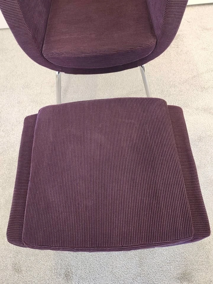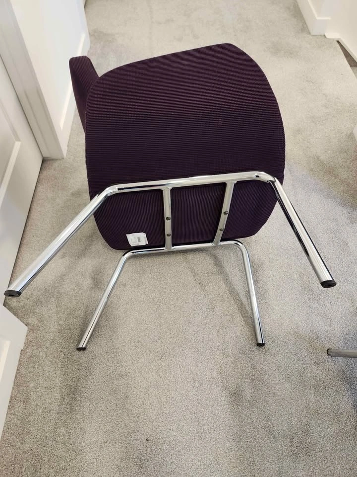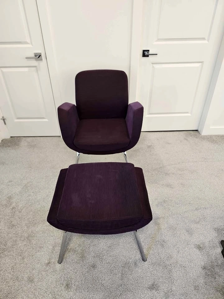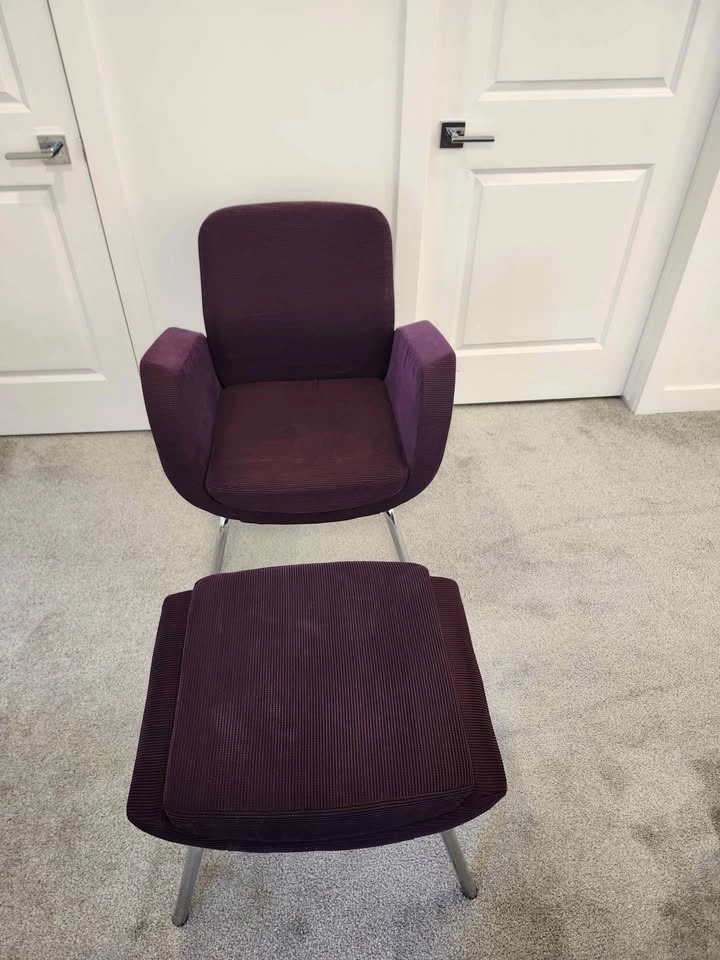 High-quality designer set from Global Furniture Group "Kate". Featuring a stunning plum/aubergine ribbed corduroy fabric and a sleek polished chrome base, this mid-century modern inspired duo is both stylish and built to last. The set is in excellent condition—clean, sturdy, and perfect for a cozy reading nook or a chic office accent. Chair dimensions: 19" D x 17" W; Ottoman dimensions: 19" D x 23" W. Stylish, durable, and ready for a new home! From a pet-free and smoke-free house. Pickup in Chestermere.