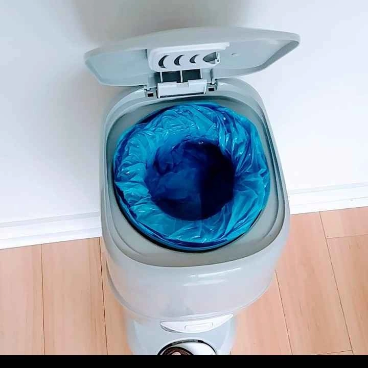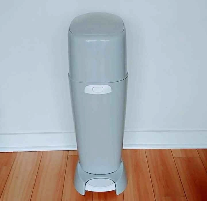 The Diaper Genie pail is grey and holds up to 36 diapers. It features a foot pedal for hands-free opening and includes refill bags, a bag cutter, and a filter case. Please note: the inner clamp flaps mechanism does not function, but it still works as a slim bin with an odor absorber filter. The pedal and lid are fully functional.