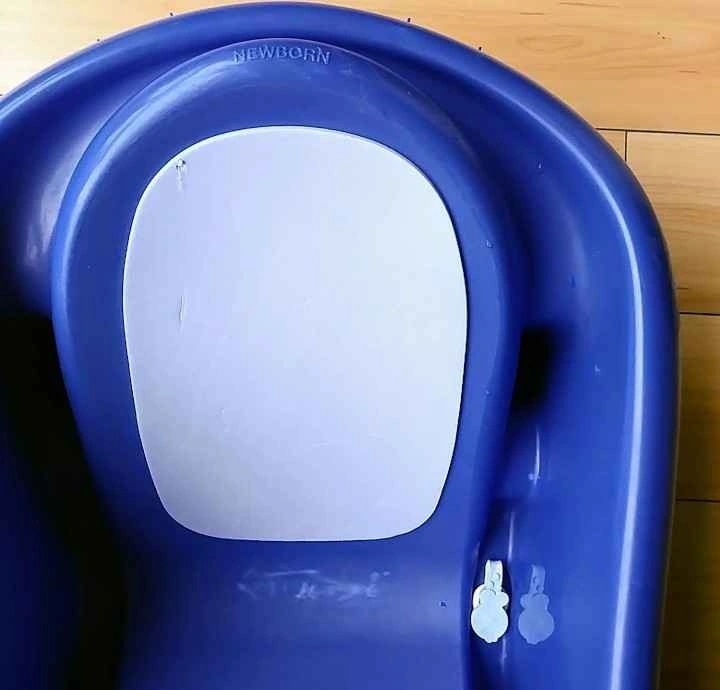 The included blue infant and toddler bathtub from The First Years has a stopper for easy emptying. It's designed for newborns to toddlers and includes a mesh sling for newborns, a padded infant recline, and a padded toddler upright position. It also has a built-in storage area.