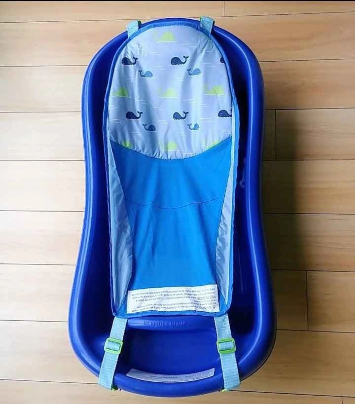 The included blue infant and toddler bathtub from The First Years has a stopper for easy emptying. It's designed for newborns to toddlers and includes a mesh sling for newborns, a padded infant recline, and a padded toddler upright position. It also has a built-in storage area.