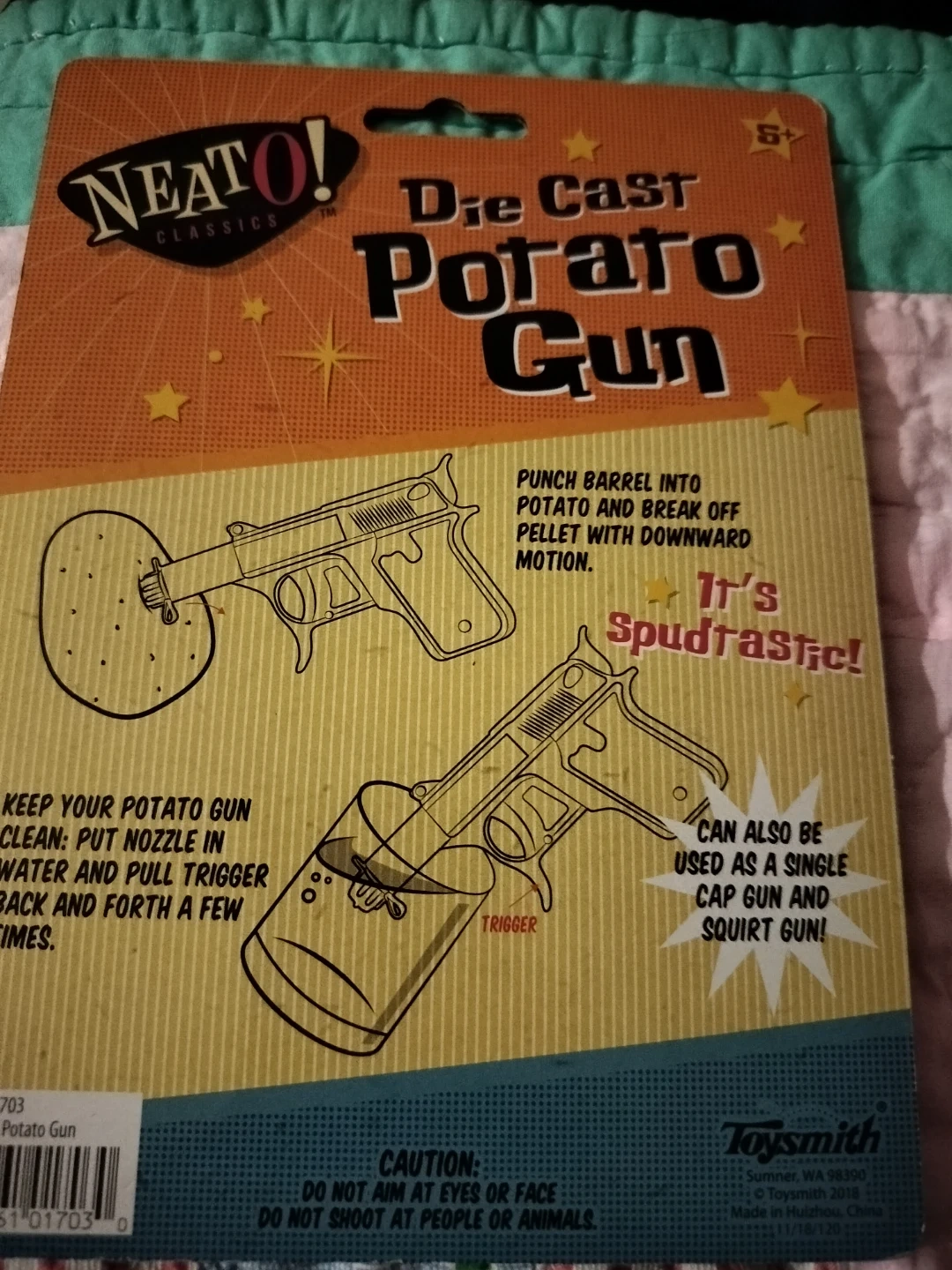 Buy & SellNeato! Classics Die Cast Potato Gun ToyNeato! Classics Die Cast Potato Gun Toy$10This is a Neato! Classics die-cast potato gun. It shoots potato pellets and can also be used as a cap gun or squirt gun. It's spudtastic!ConditionNewWHERE TO MEETMount PleasantView MapSELLERverifiedOliviaMount Pleasant60045 reviews0 chats·1 favorites·2 viewsSEND CHAT TO SELLERHi Olivia! I’m interested in your listing.Hi Olivia! I’m interested in your listing.Get the Karrot app to chatSign In to chat