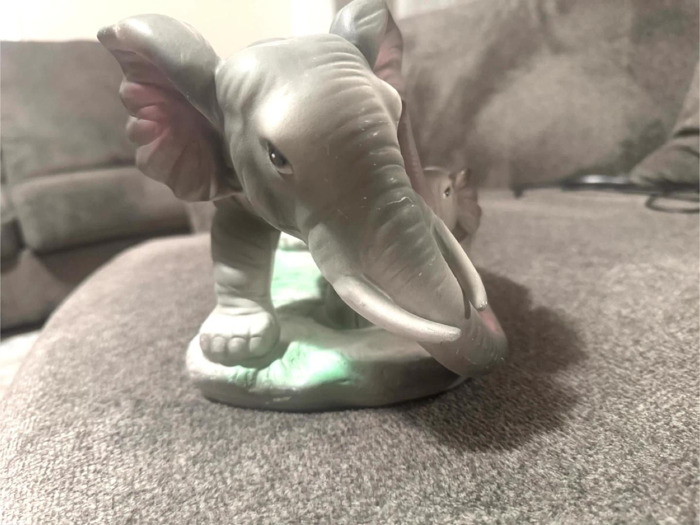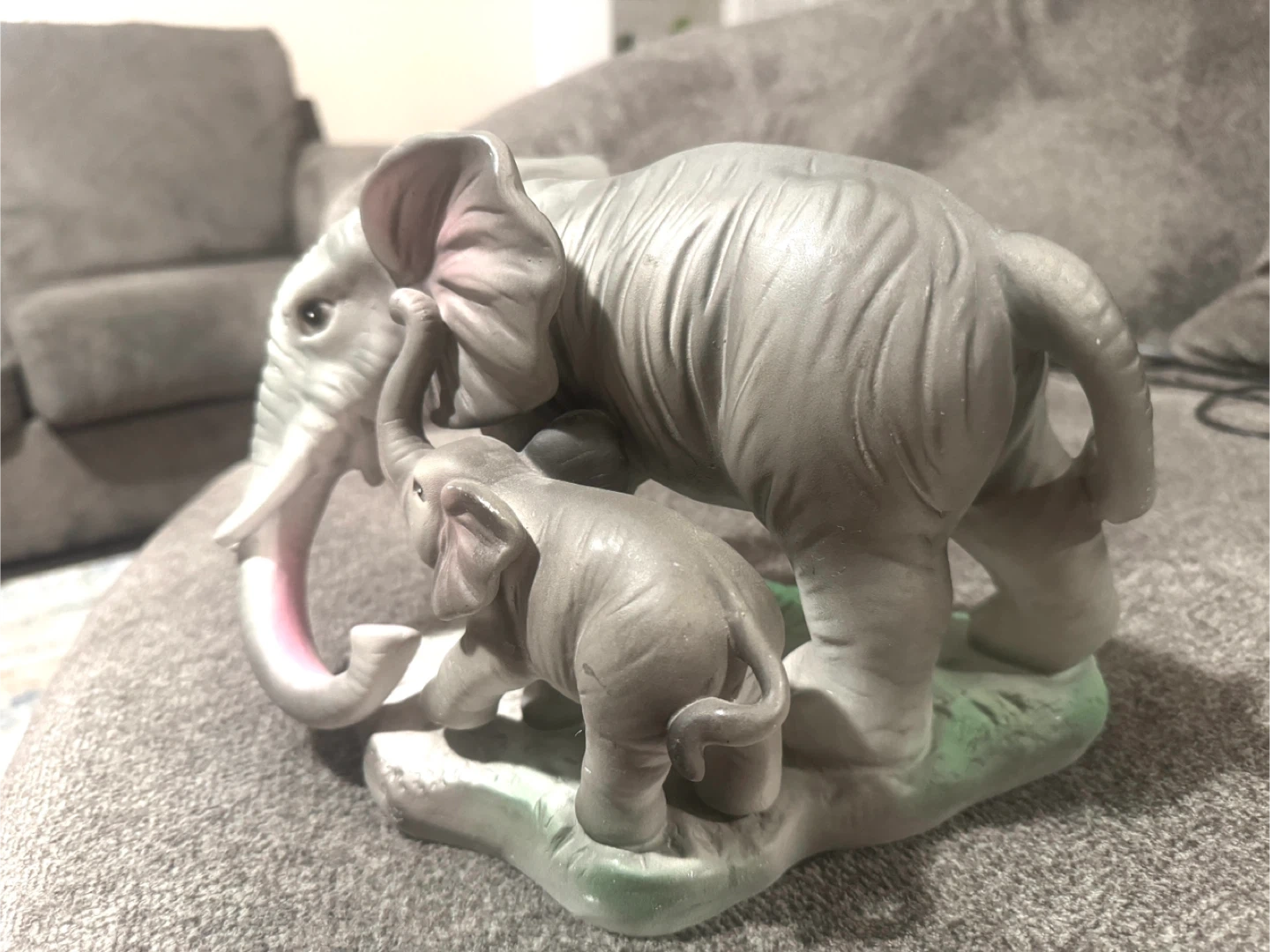 It's a ceramic figurine featuring a mother elephant and calf. The elephants are grey with pink accents inside their ears and trunks. This decorative piece would suit an elephant lover's collection.