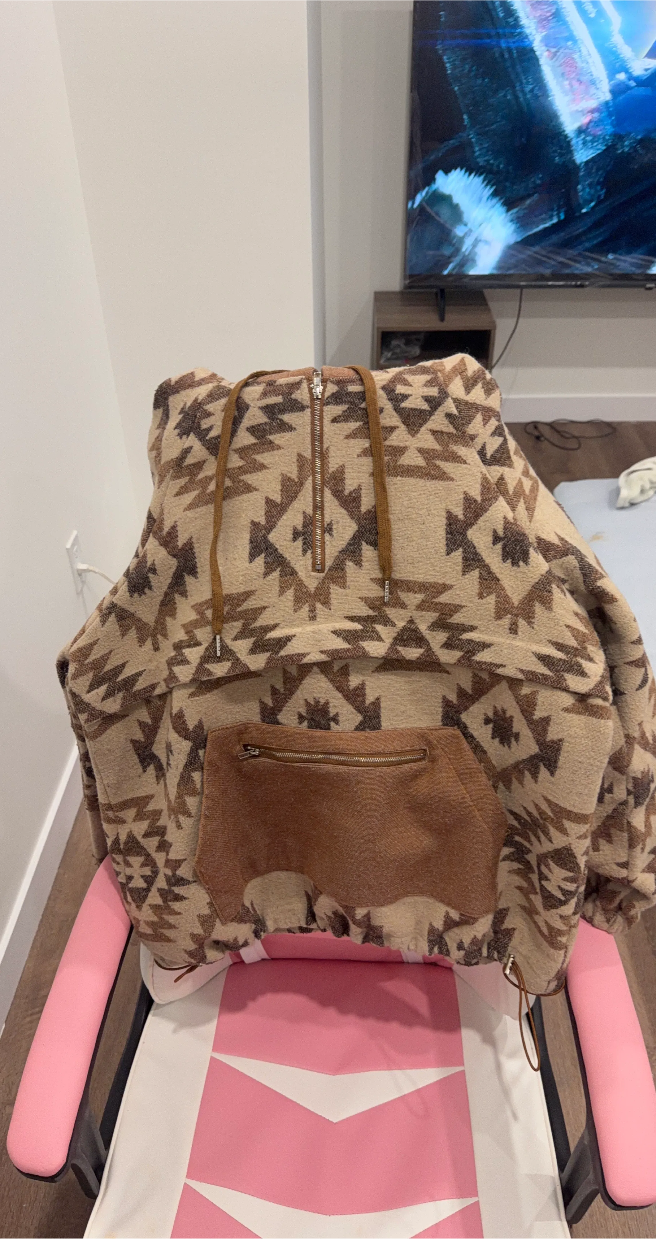 Cozy quarter zip hoodie featuring a classic southwestern geometric pattern. It has a kangaroo pocket with a zipper closure and adjustable drawstring hood. This pullover is perfect for chilly days and adds a stylish touch to any casual outfit.