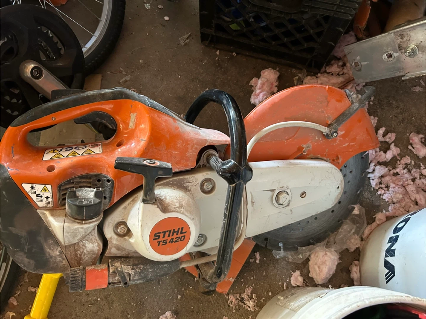 Stihl TS 420 cut-off saw for sale. This heavy-duty tool is designed for cutting concrete, asphalt, and other tough materials. It's a powerful machine that gets the job done efficiently. Features a durable build for demanding job sites.
