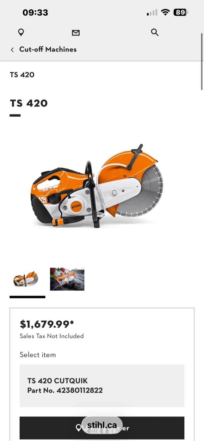 Stihl TS 420 cut-off saw for sale. This heavy-duty tool is designed for cutting concrete, asphalt, and other tough materials. It's a powerful machine that gets the job done efficiently. Features a durable build for demanding job sites.