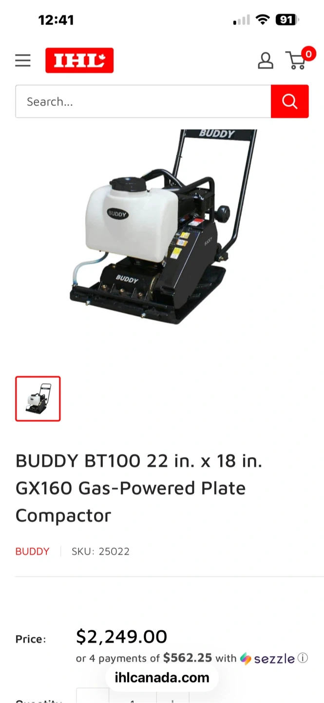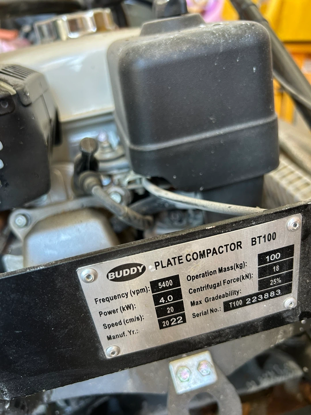 Buddy BT100 plate compactor with GX160 engine. Operation mass of 100kg. Power is 4.0 kW. Manufactured in 2022.