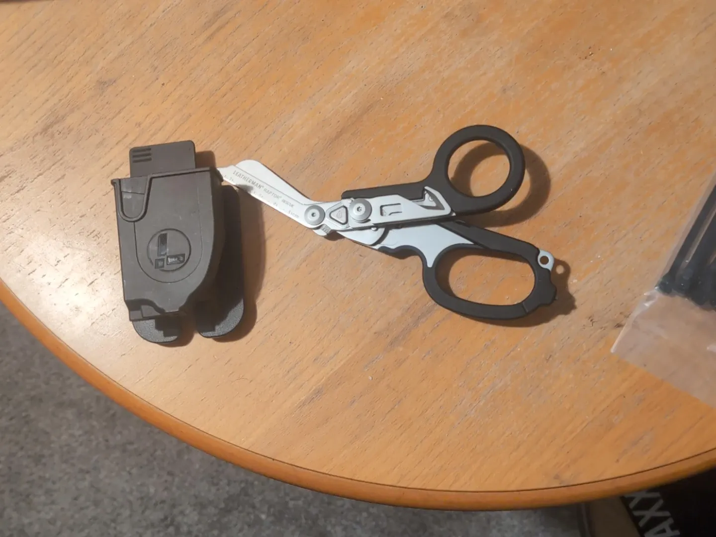 Leatherman Raptor Rescue shears with a black holster included. These medical shears are designed for emergency use. They're made with durable materials for reliable performance.