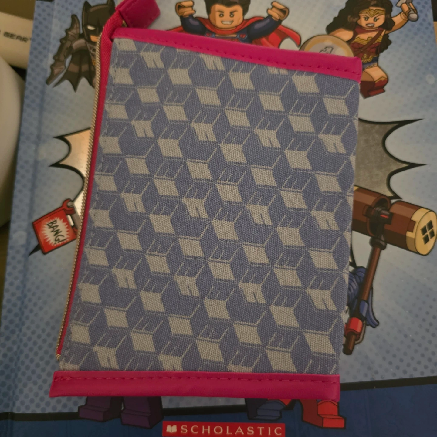 This Estee Lauder cosmetic bag is perfect for organizing your makeup. It features a stylish geometric pattern with pink trim and a zippered closure. This bag is ideal for travel or everyday use!