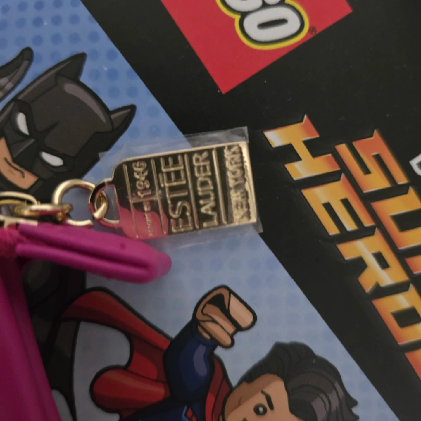 This Estee Lauder cosmetic bag is perfect for organizing your makeup. It features a stylish geometric pattern with pink trim and a zippered closure. This bag is ideal for travel or everyday use!