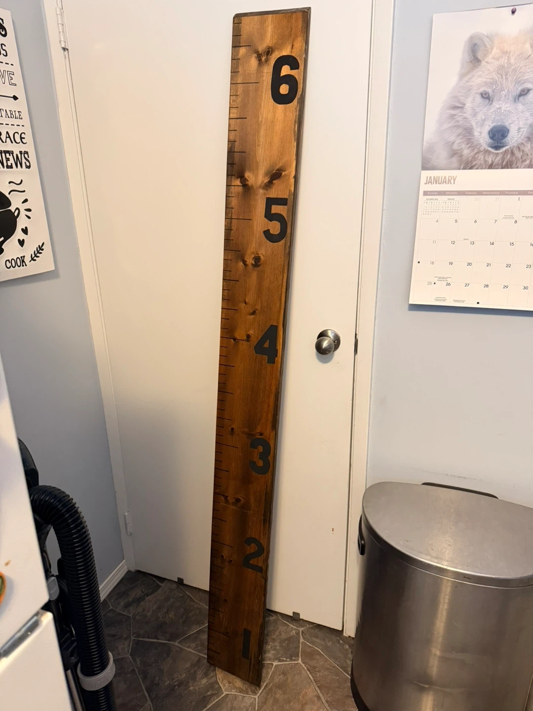 This is a wooden growth chart ruler. It features markings from 1 to 6, with clear numerical labels. It's made of dark stained wood. This chart is great for tracking a child's height!