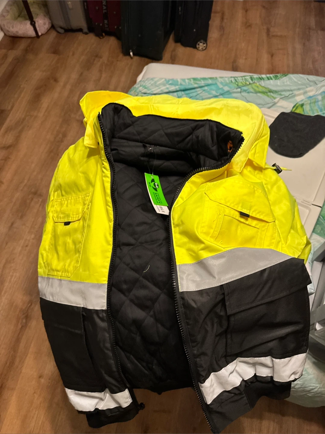 This is a hi-vis work jacket and matching pants. Both pieces are quilted for warmth and feature reflective stripes. The jacket has multiple pockets.