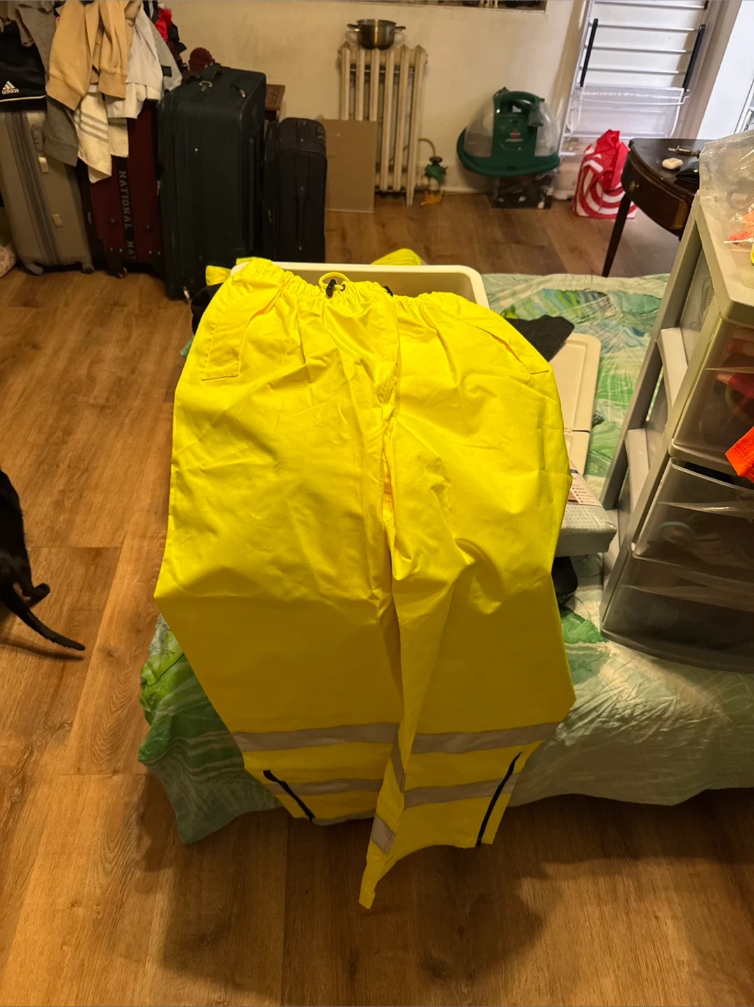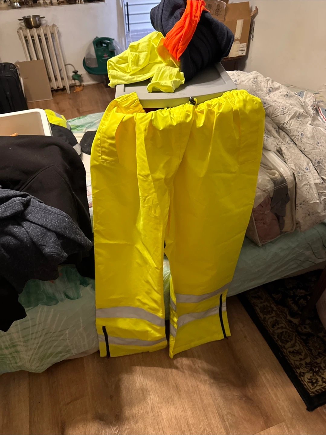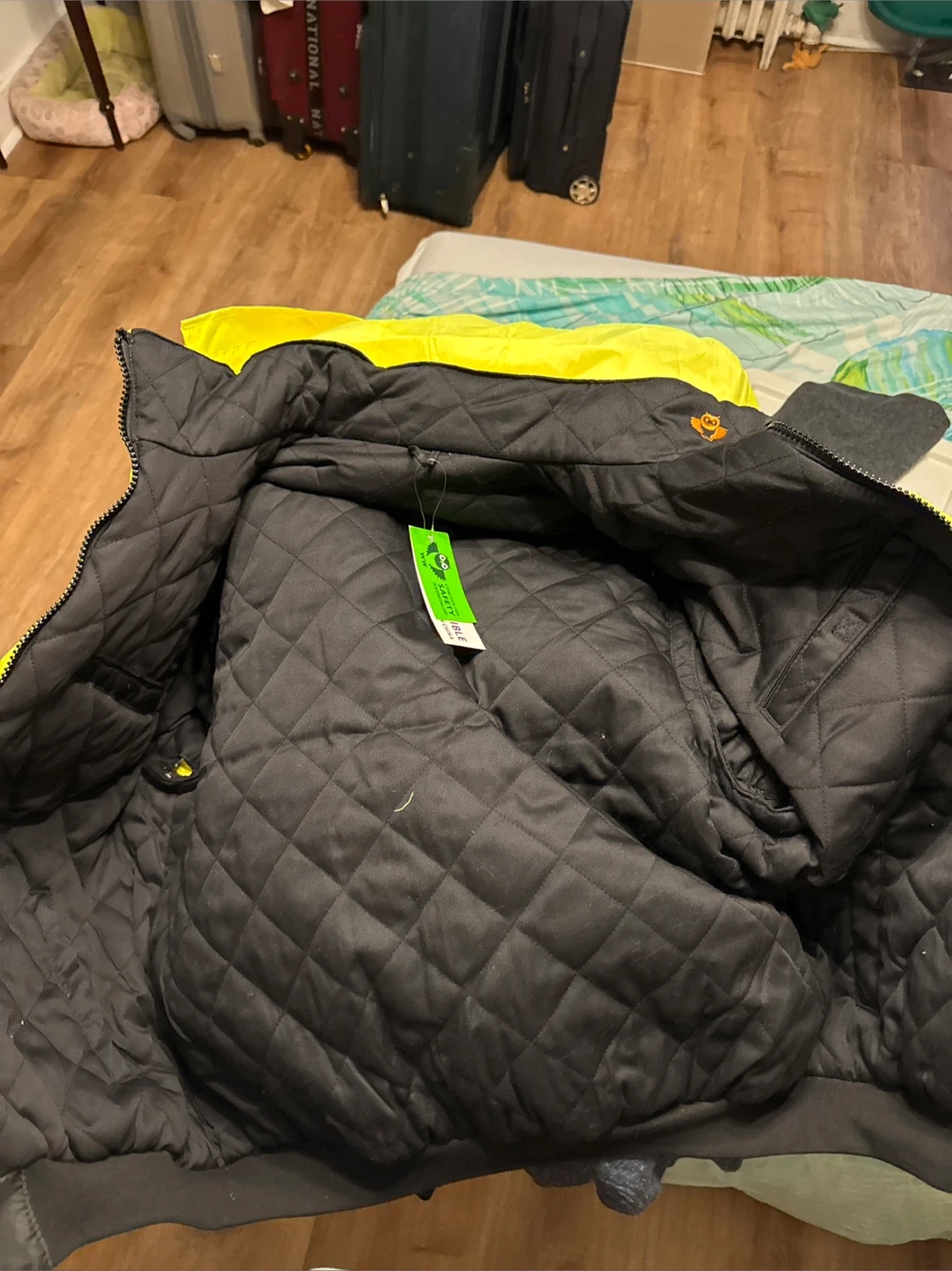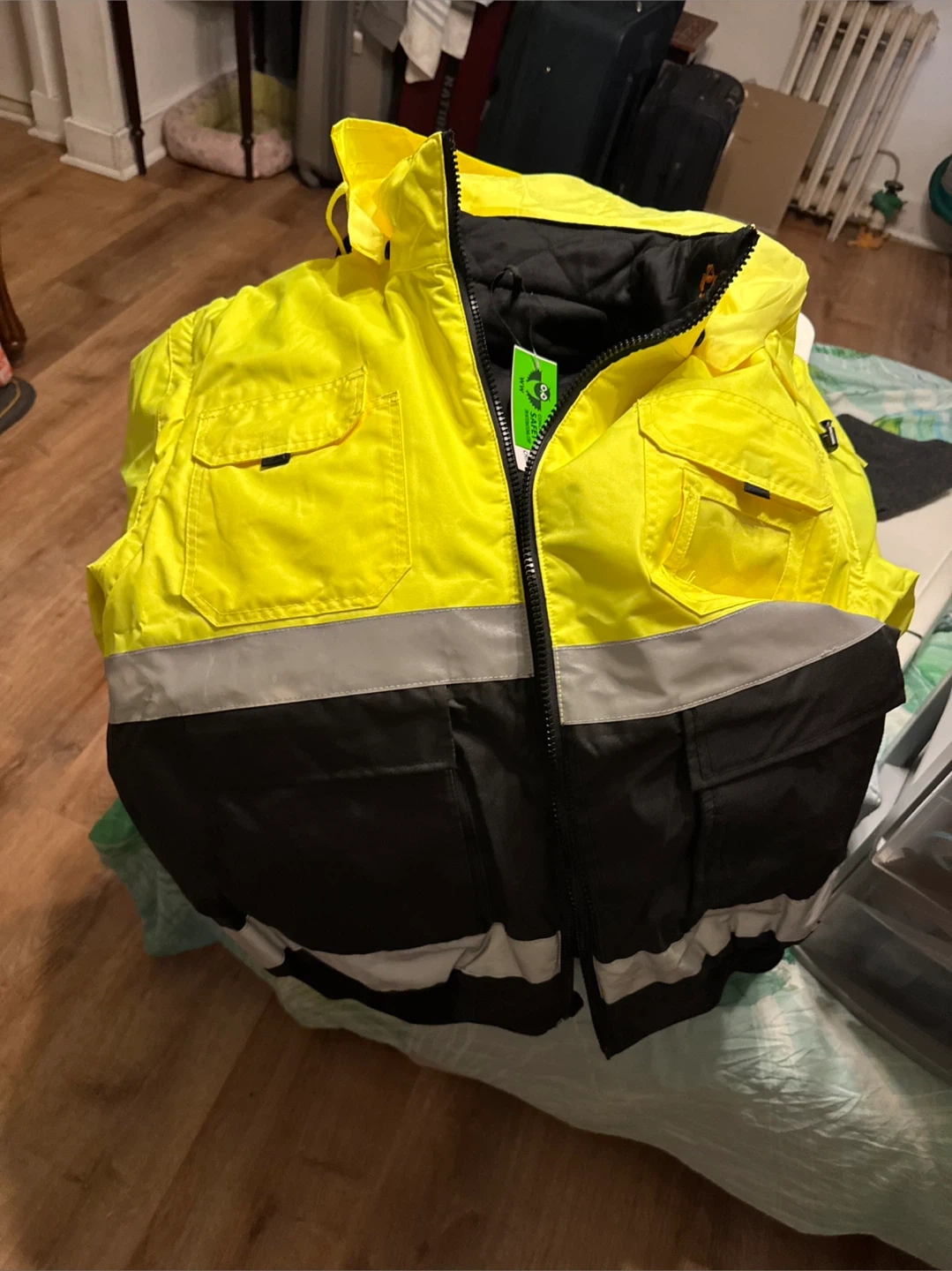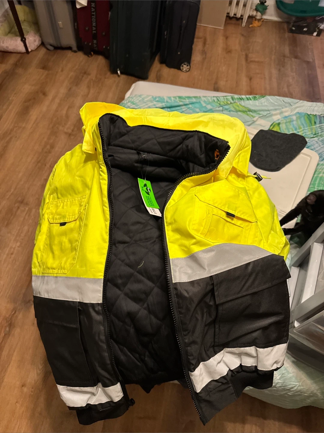 This is a hi-vis work jacket and matching pants. Both pieces are quilted for warmth and feature reflective stripes. The jacket has multiple pockets.