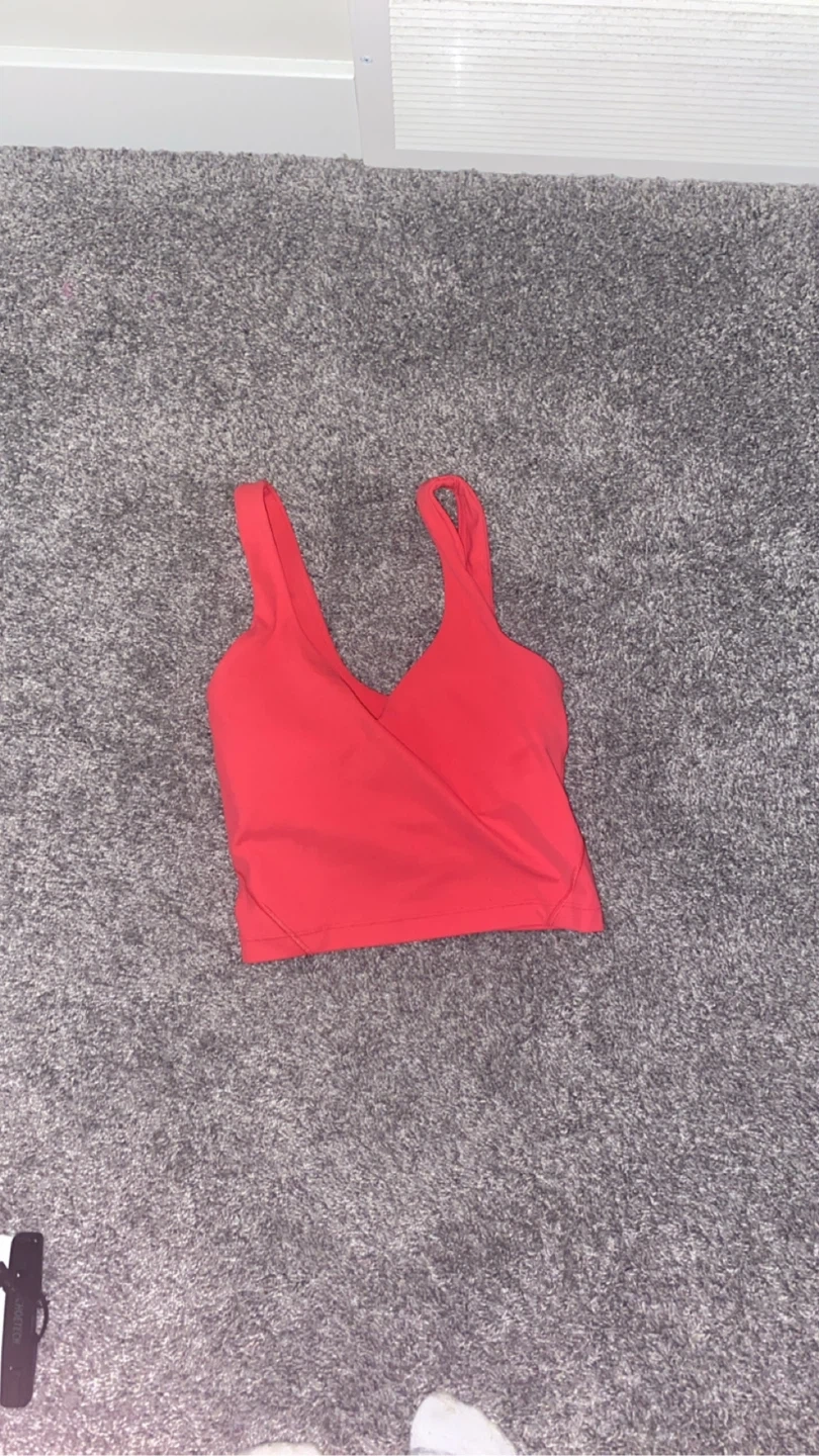 Coral cropped tank top. It's a vibrant red-orange colour. Made from a stretchy, soft fabric.